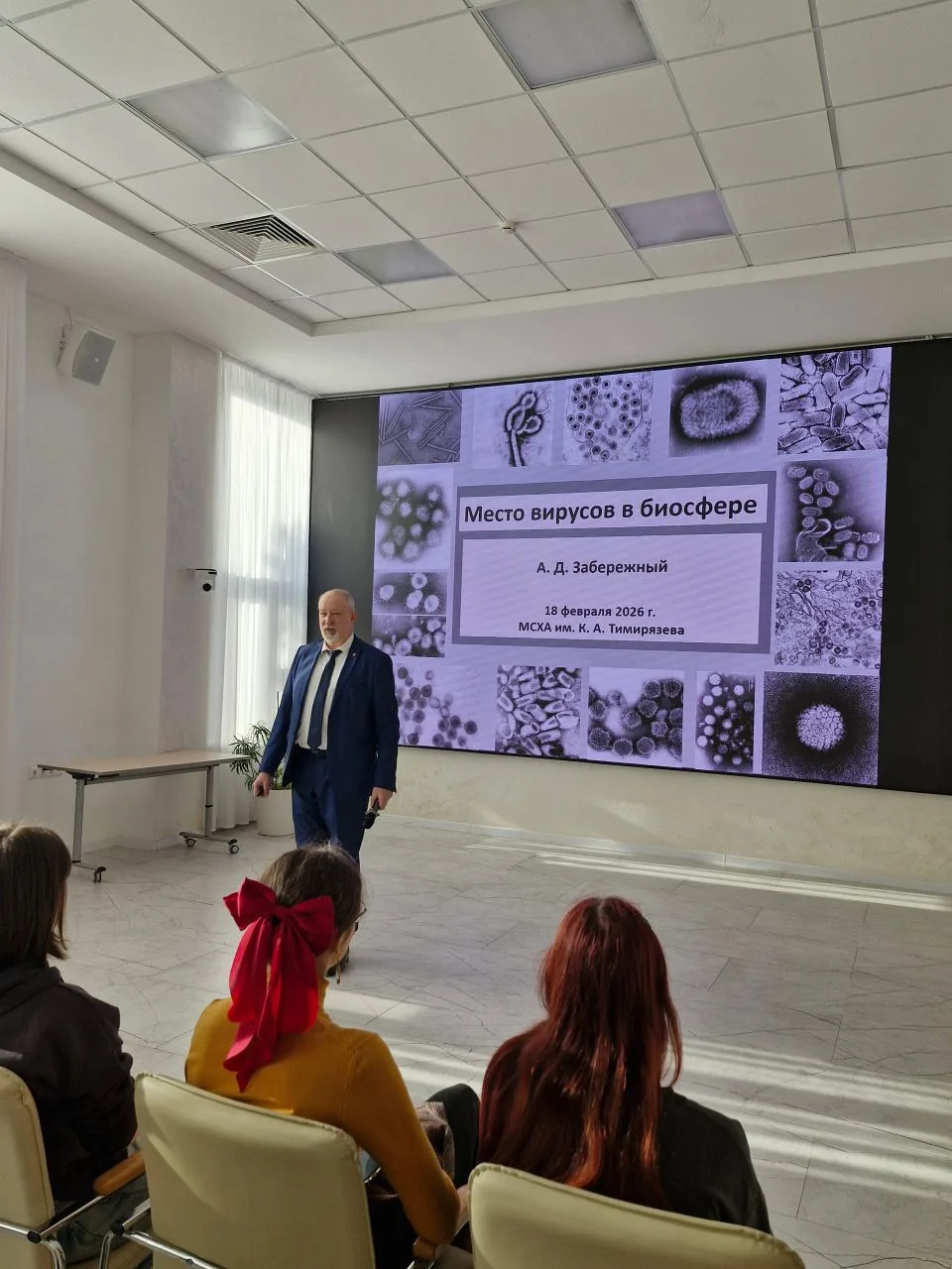 В рамках празднования Дня российской науки институт Агробиотехнологии посетил академик РАН, доктор биологических наук, профессор Алексей Дмитриевич Забережный. Учёный прочитал лекцию «Место вирусов в биосфере» для студентов, обучающихся по направлению «Биотехнология».