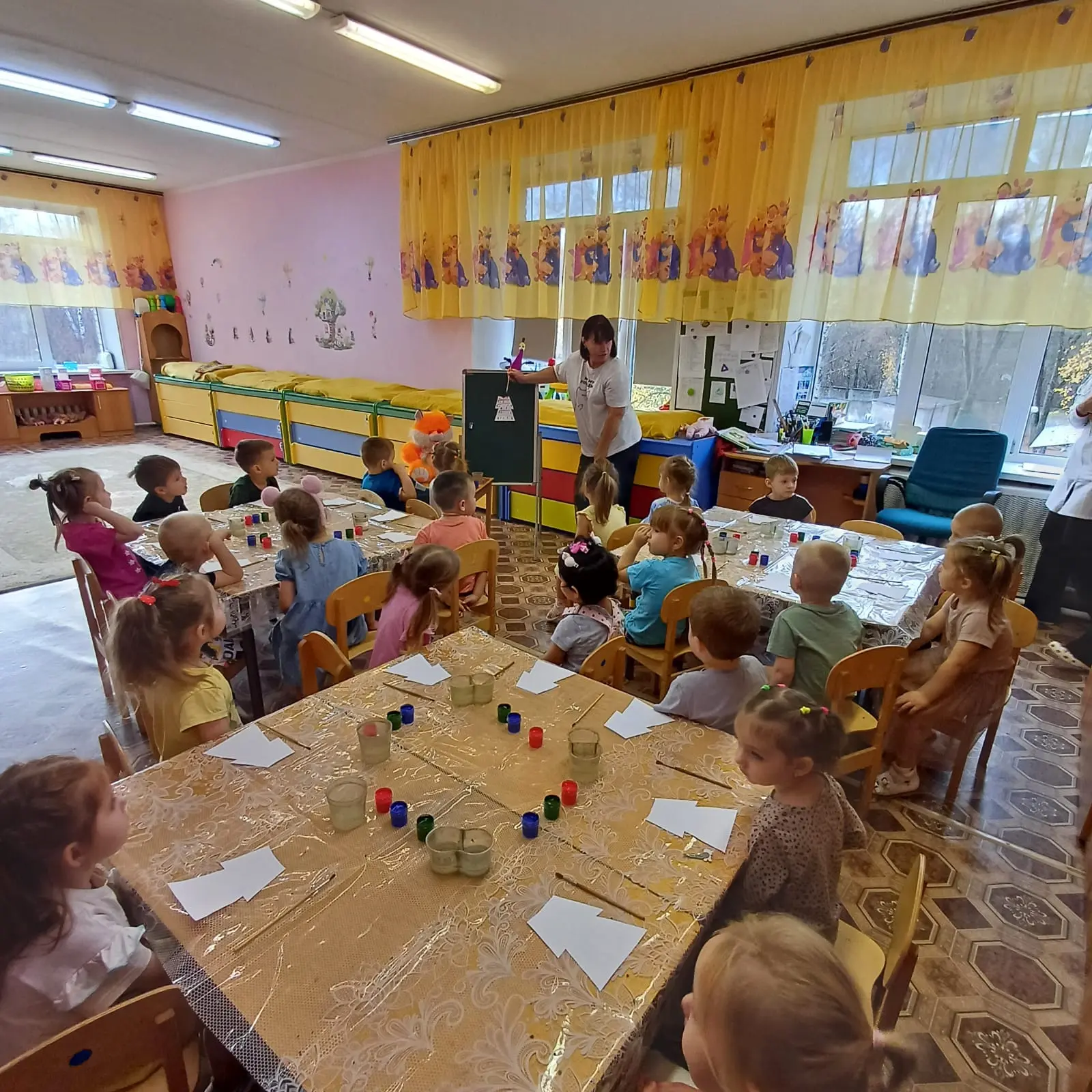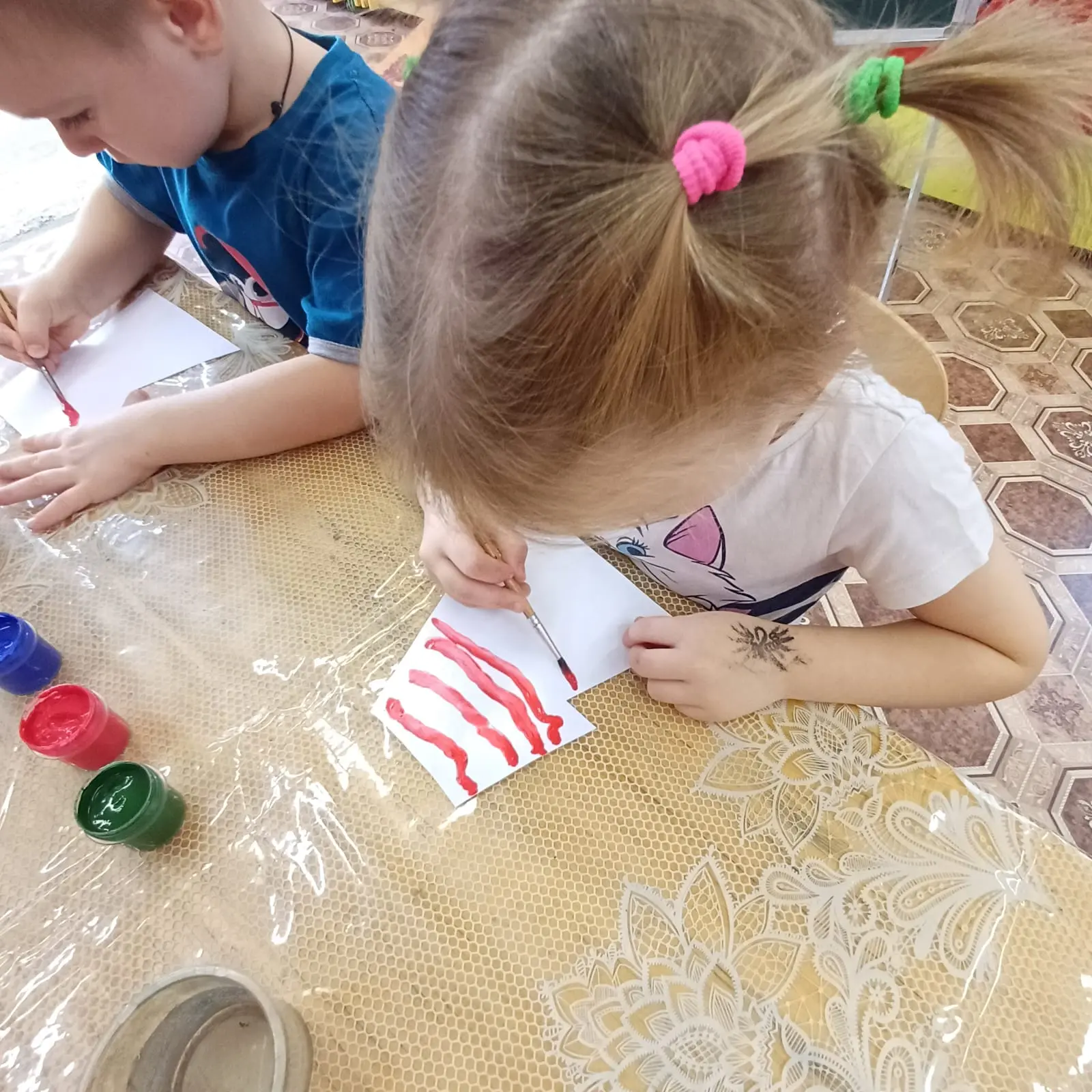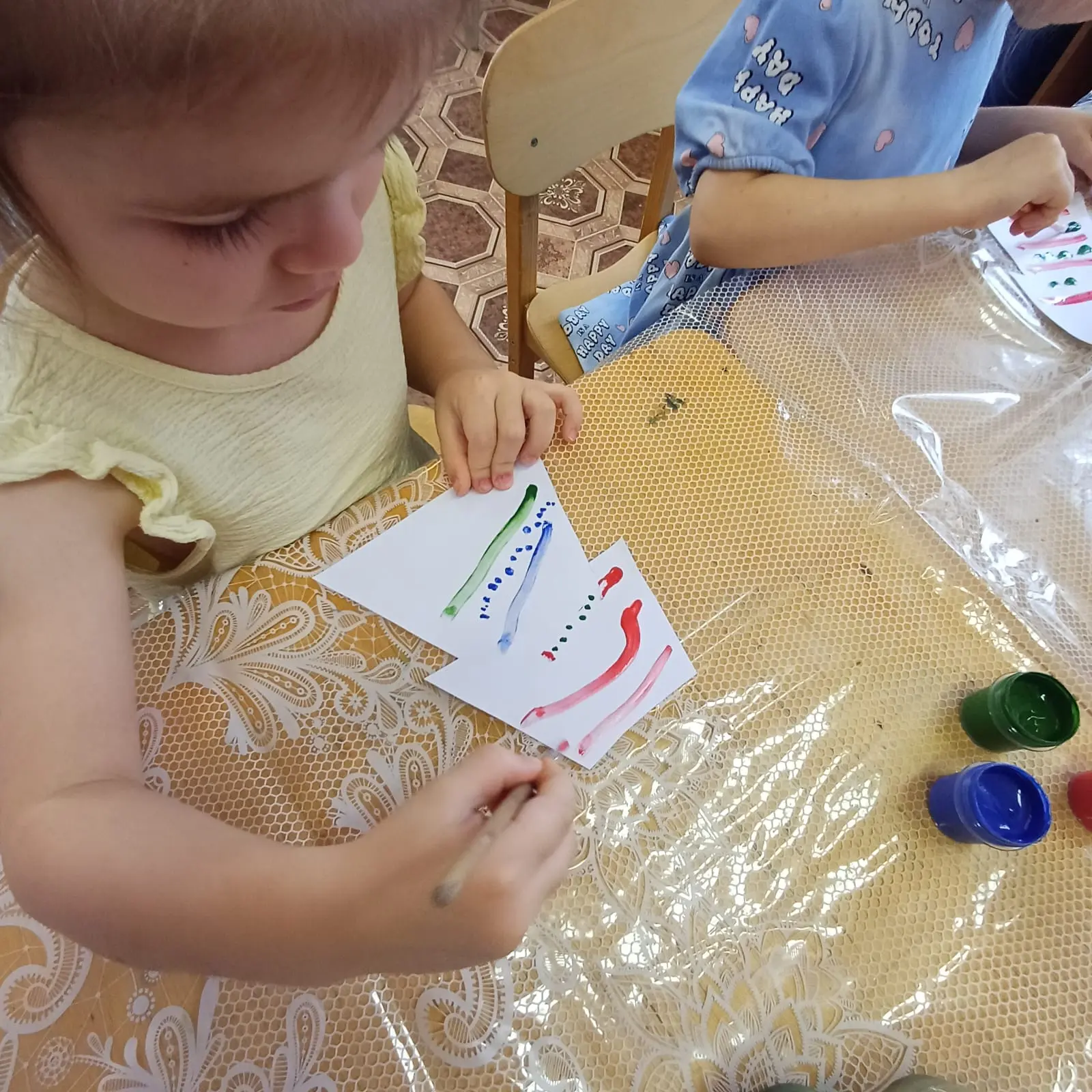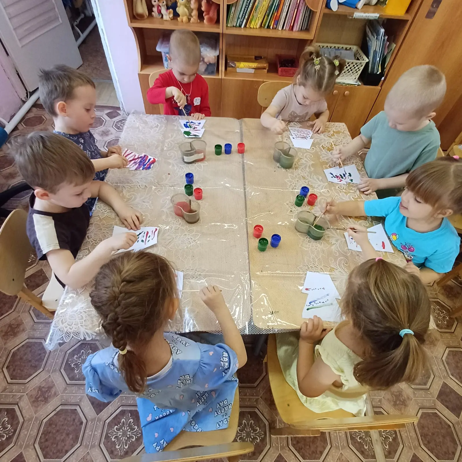 На занятии дети учились рисовать кистью узор из точек и полос по мотивам дымковской росписи, используя приём тычка.