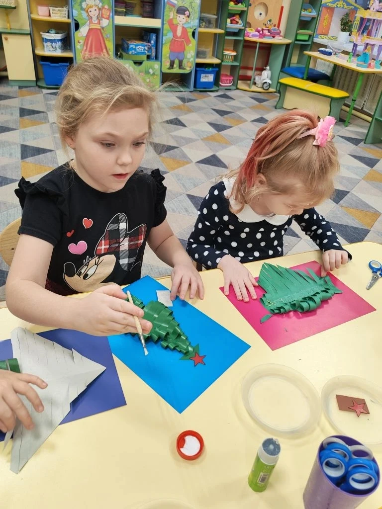 Развивать умение выполнять объёмную аппликацию- новогоднюю ёлочку, используя приём разрезания квадрата на полоски. Воспитывать интерес к новогодним традициям.