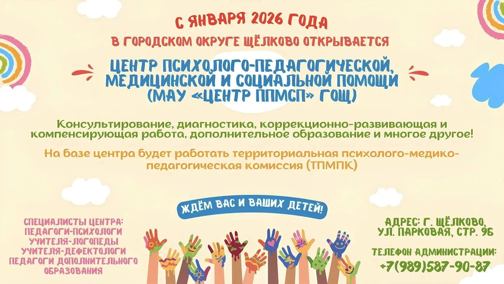 ✨ Рады сообщить, что с января 2026 года в городском округе Щёлково начинает работу Центр психолого-педагогической, медицинской и социальной помощи (МАУ «Центр ППМСП» ГОЩ).