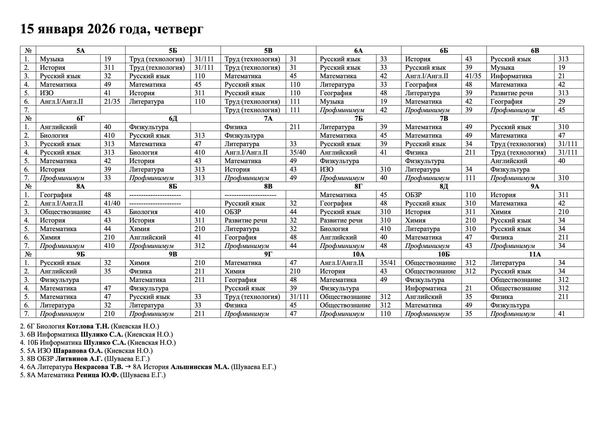 ⚡Расписание учебных занятий 5–11 классов на 15 января (с изменениями)