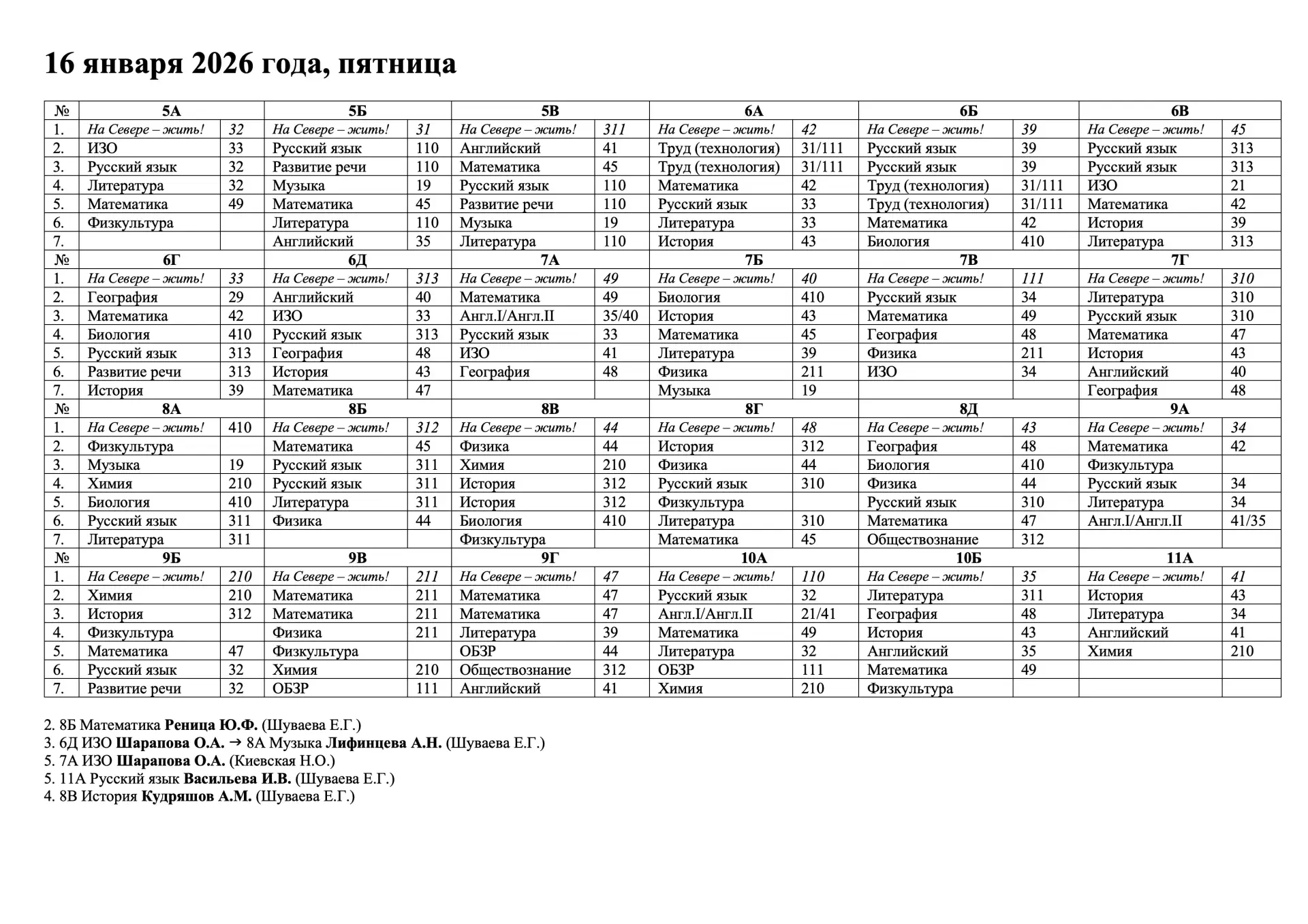 ⚡Расписание учебных занятий 5–11 классов на 16 января (с изменениями)
