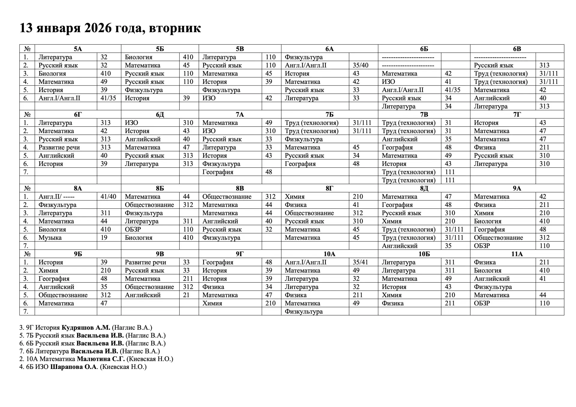⚡❗Расписание учебных занятий 5–11 классов на 13 января (с изменениями)