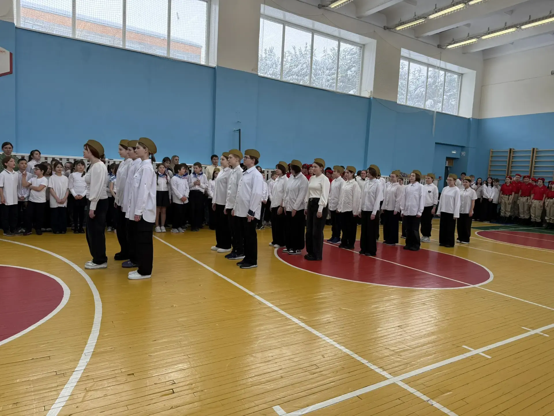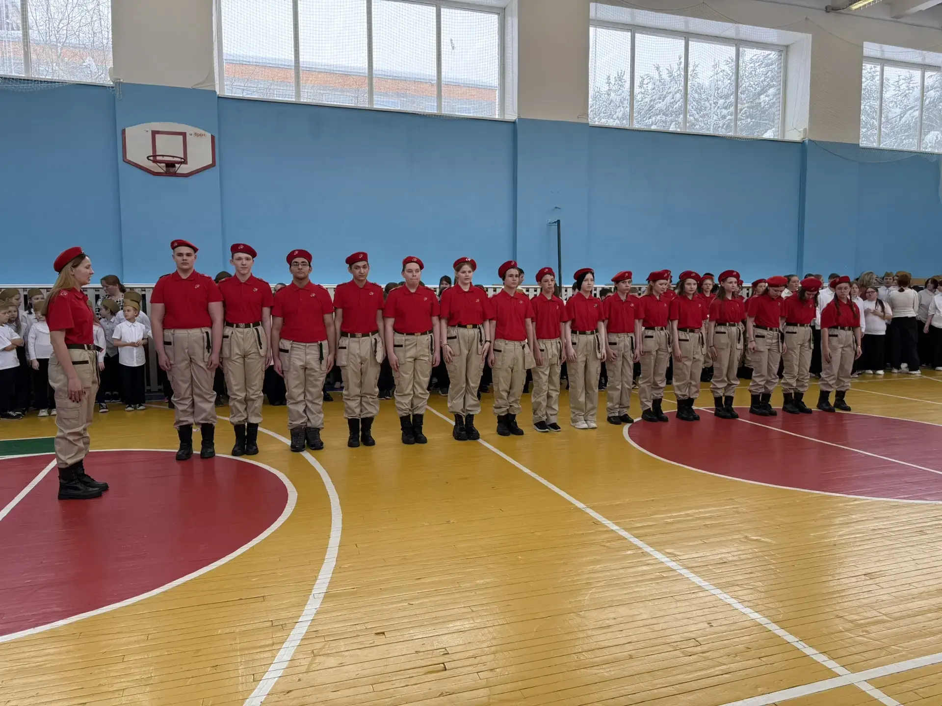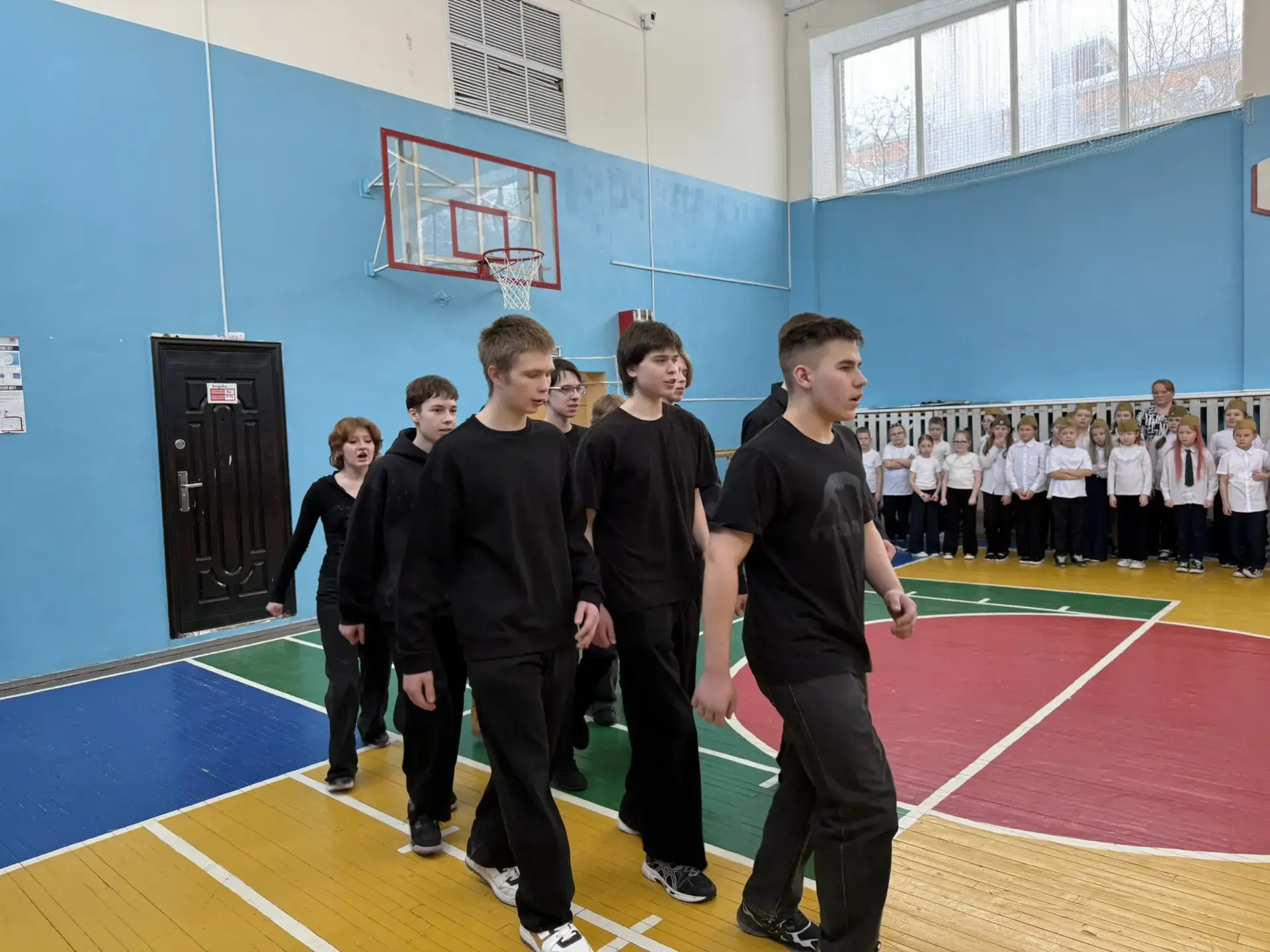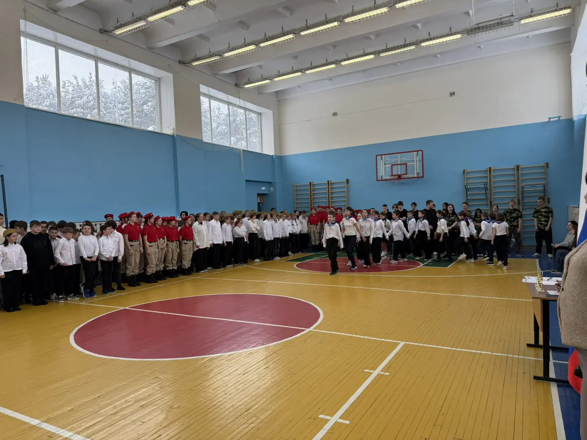 Ученики с гордостью маршировали по залу, исполняя военные песни. Особо хочется отметить командиров отрядов — именно от их громкого голоса и уверенности зависела синхронность всей команды.