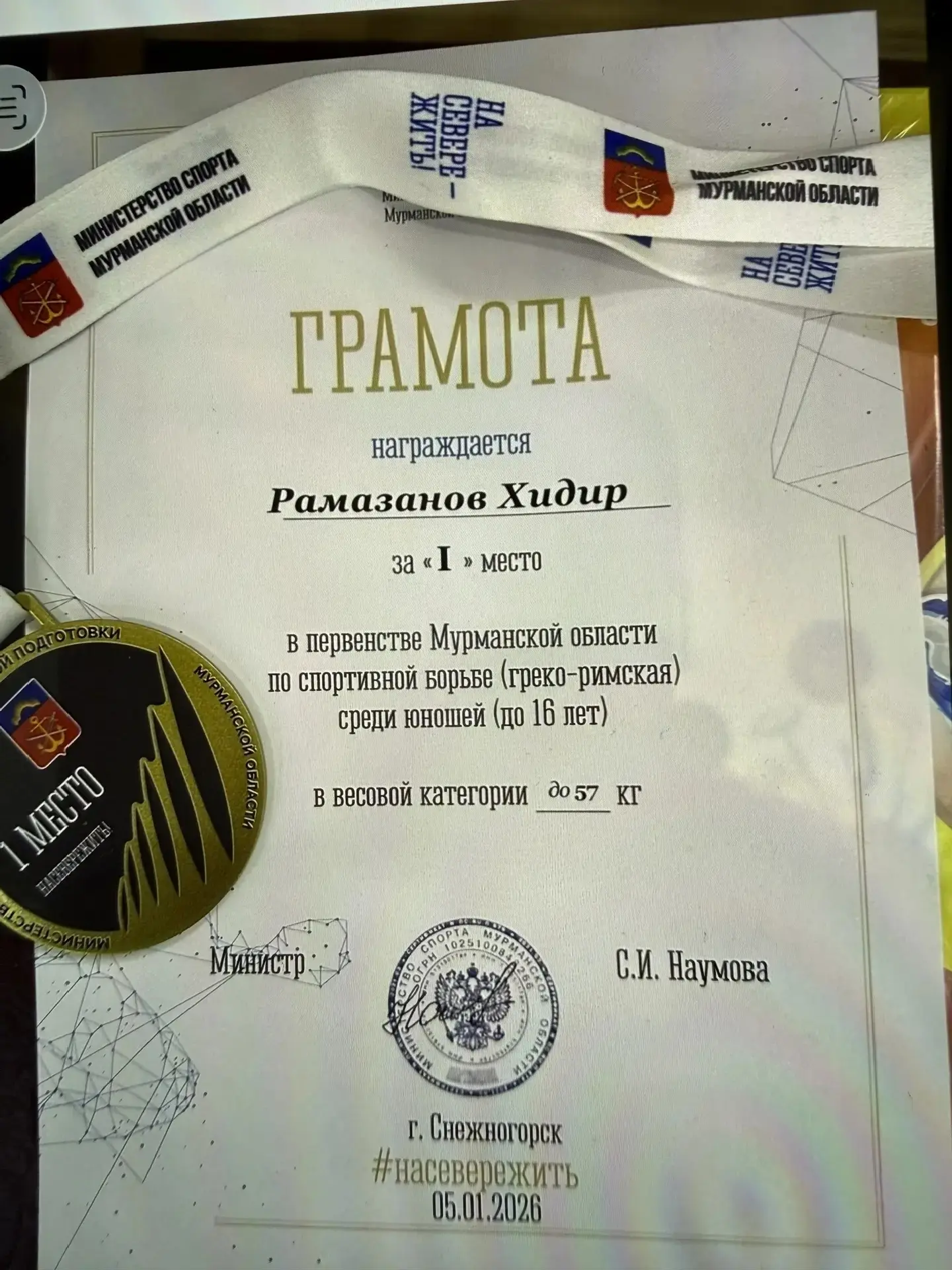 🏆 Рамазанов Хидир, кадет 7к3 класса, одержал победу🥇в Первенстве Мурманской области по греко-римской борьбе!