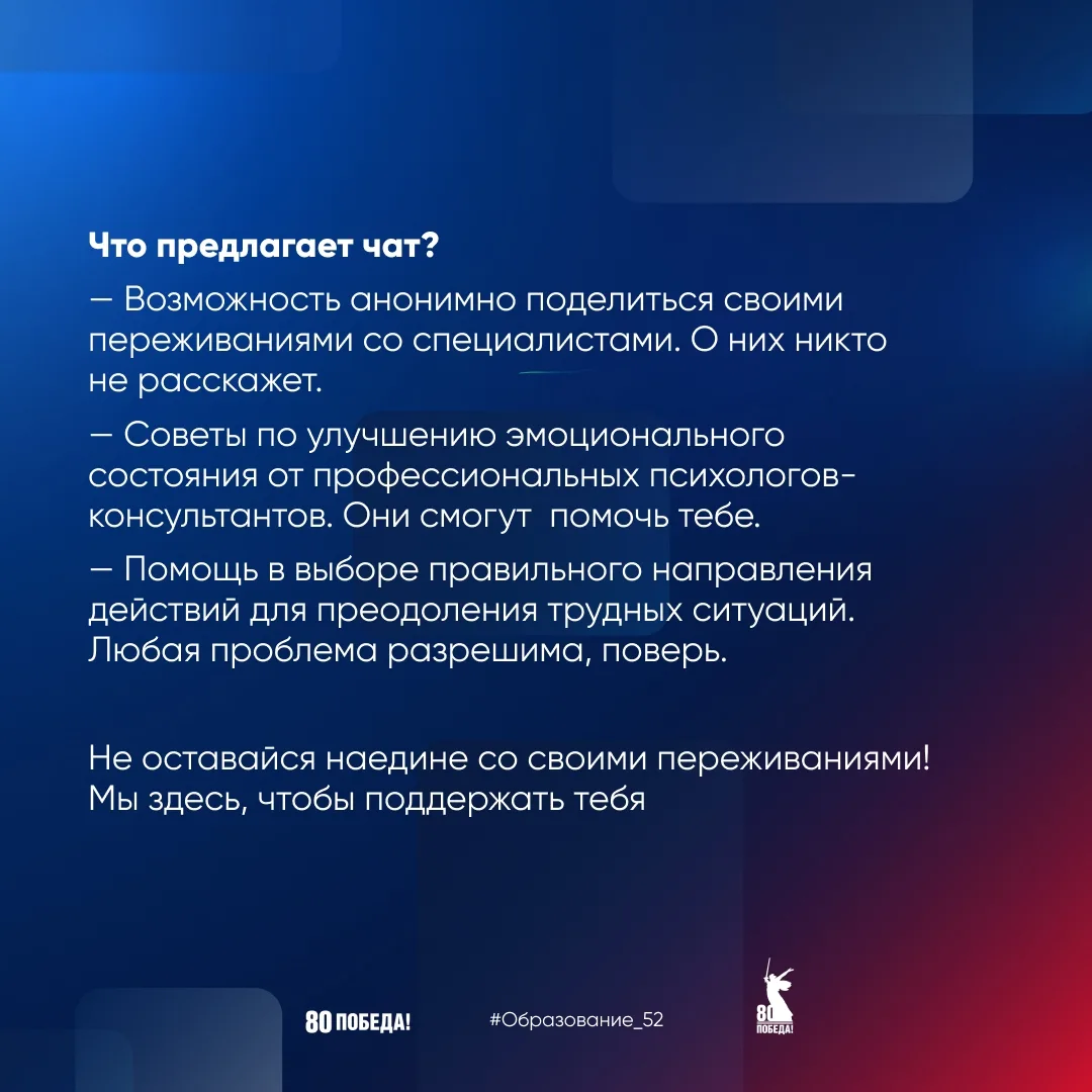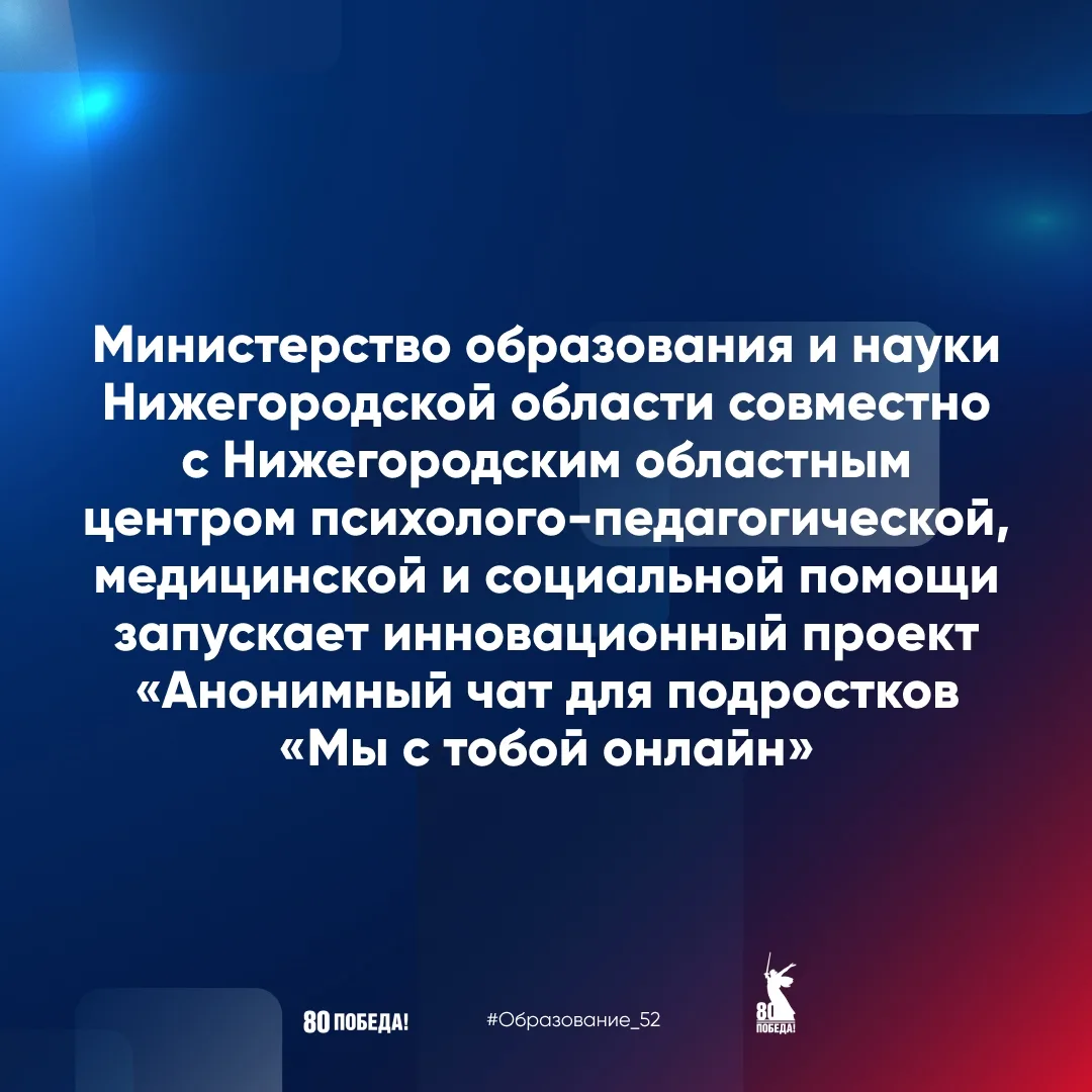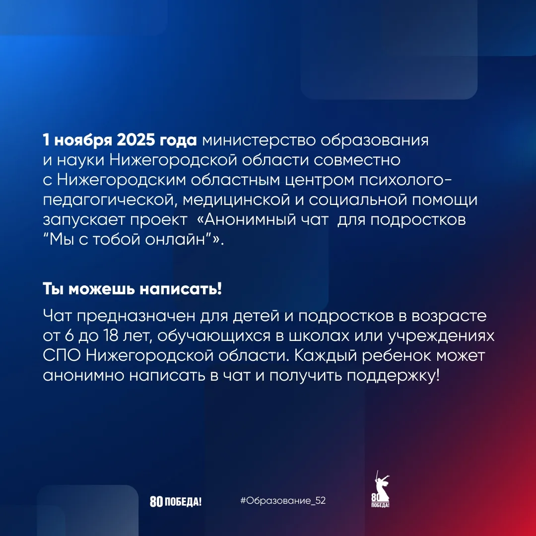 📅 1 ноября 2025 года министерство образования и науки Нижегородской области совместно с Нижегородским областным центром психолого-педагогической, медицинской и социальной помощи запускает проект «Анонимный чат для подростков «Мы с тобой онлайн».