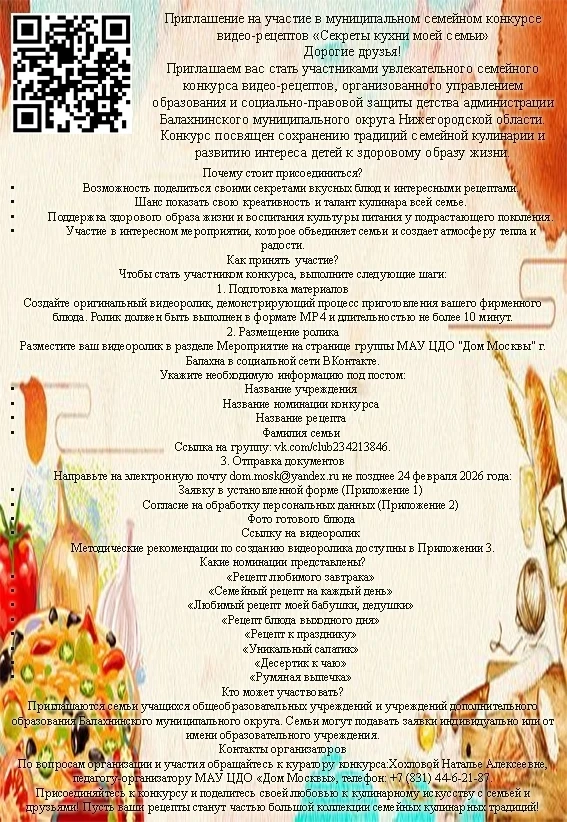Лучшие рецепты соберут в цифровую семейную кулинарную книгу нашего округа, а авторов ждут приятные сюрпризы! Не упустите шанс оставить свой след в истории наших семейных традиций. Готовьте, снимайте и участвуйте!