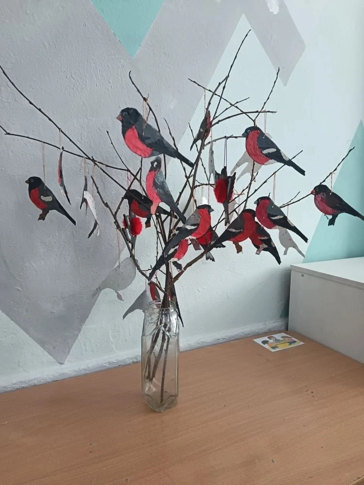 Провели обучающую викторину, где по силуэту и голосу отгадывали зимующих птиц, выбирали для них правильный и полезный корм. На уроке технологии смастерили снегирей в технике "пластилинопластика" и расселили их на веточках. Также у ребят на окне класса висит кормушка, где они подкармливают пернатых друзей.