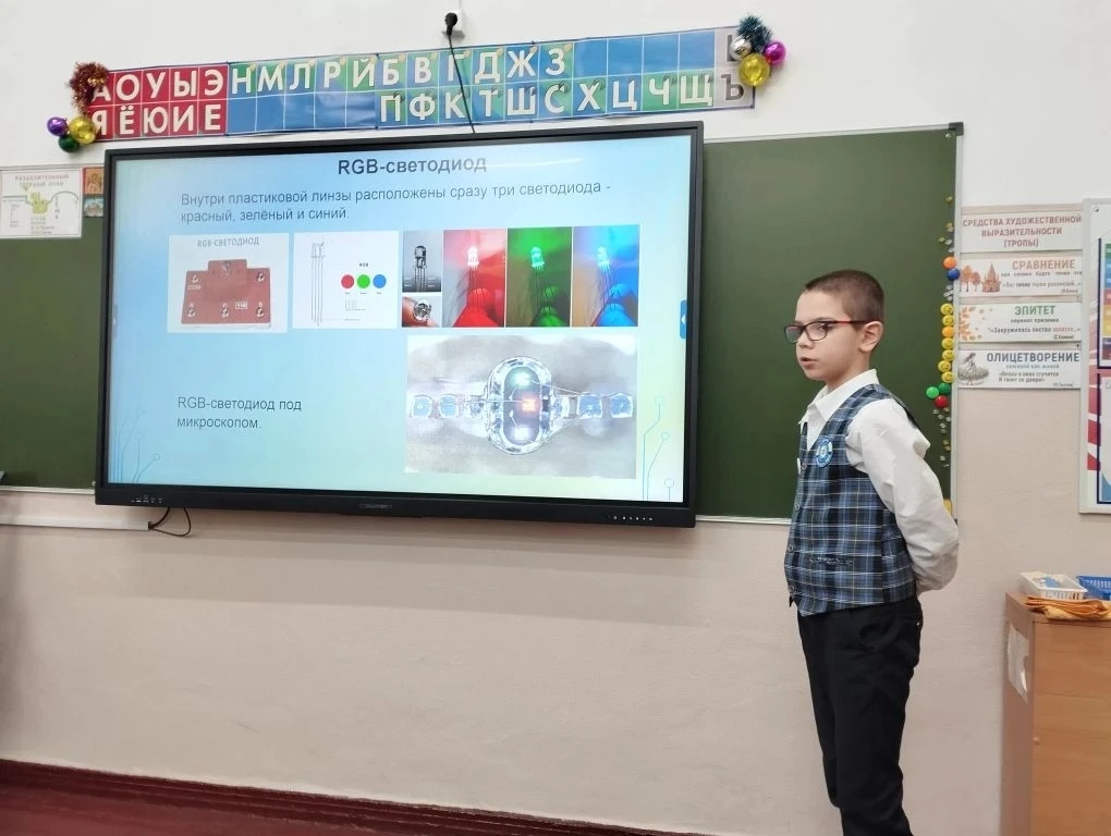 * Морев Кирилл, ученик 3" г" класса с работой " Удивительный мир светодиодов", руководитель Гордеева Е. А.