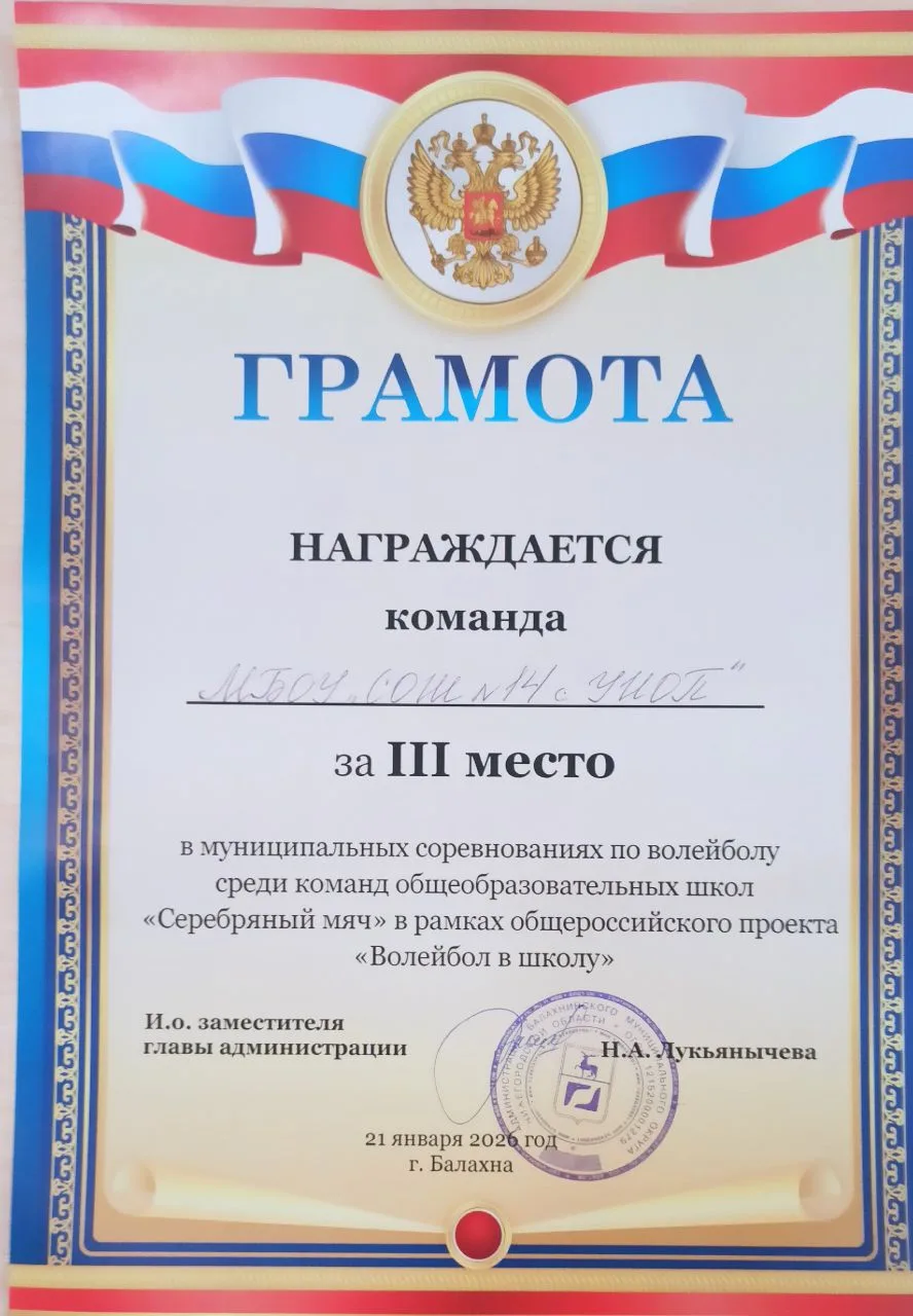 19.01.2026 г. в МАОУ СОШ № 10 имени ГЕРОЯ СОВЕТСКОГО СОЮЗА А. М. Кузнецова проходили муниципальные соревнования по волейболу среди команд образовательных учреждений "Серебряный мяч" в рамках общероссийского проекта "Волейбол в школу" Команда девушек МБОУ СОШ № 14 с УИОП заняла 3 место. Состав команды: Грачёва Софья, Ермушова Анжелика, Козлова Анна, Казакова Варвара, Дряблова Варвара, Медведева Дарья, Пронькина София.