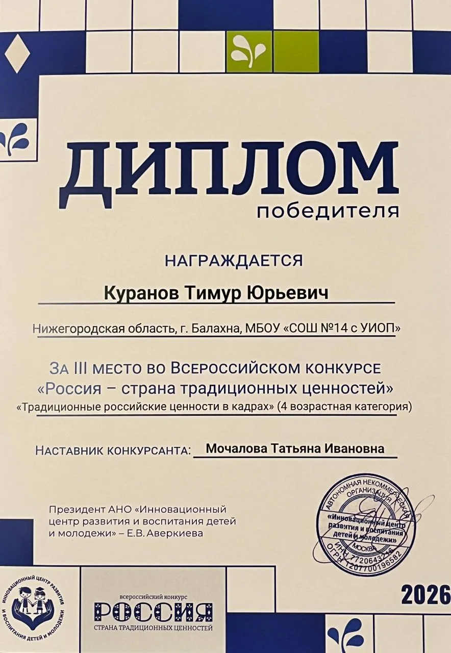 Куранов Тимур, учащийся 10М класса МБОУ «СОШ №14 с УИОП», принял участие во Всероссийском конкурсе «Россия - страна традиционных ценностей». Он стал одним из 15 000 участников из всех регионов страны, которые представили на этот конкурс свои творческие работы. 16 января этого года в Москве состоялась торжественная Церемония награждения, объединившая финалистов, лауреатов и победителей — талантливых детей и молодых людей, которые в своих видеороликах, презентациях и рисунках раскрыли суть традиционных российских ценностей, таких как крепкая семья, патриотизм, достоинство, милосердие и справедливость. Тимур талантливо снял душевный видеоролик о преемственности поколений в своей семье. По решению жюри этого конкурса Тимур был награждён Дипломом победителя, заняв III место в номинации «Традиционные российские ценности в кадрах» в старшей возрастной группе. От всей души поздравляем Тимура и желаем ему дальнейших творческих успехов!