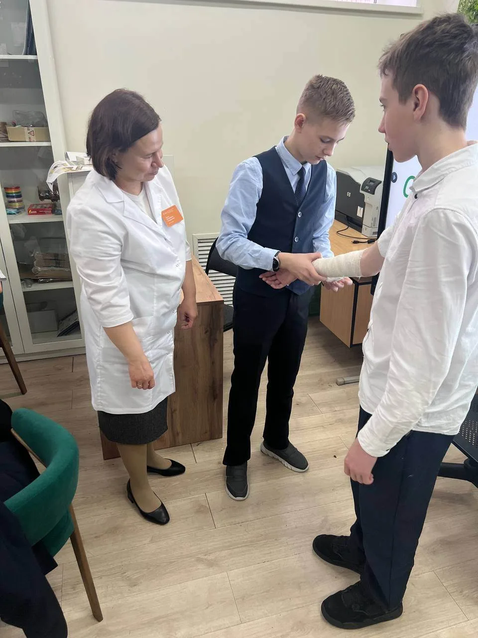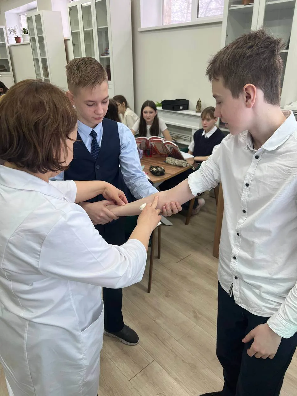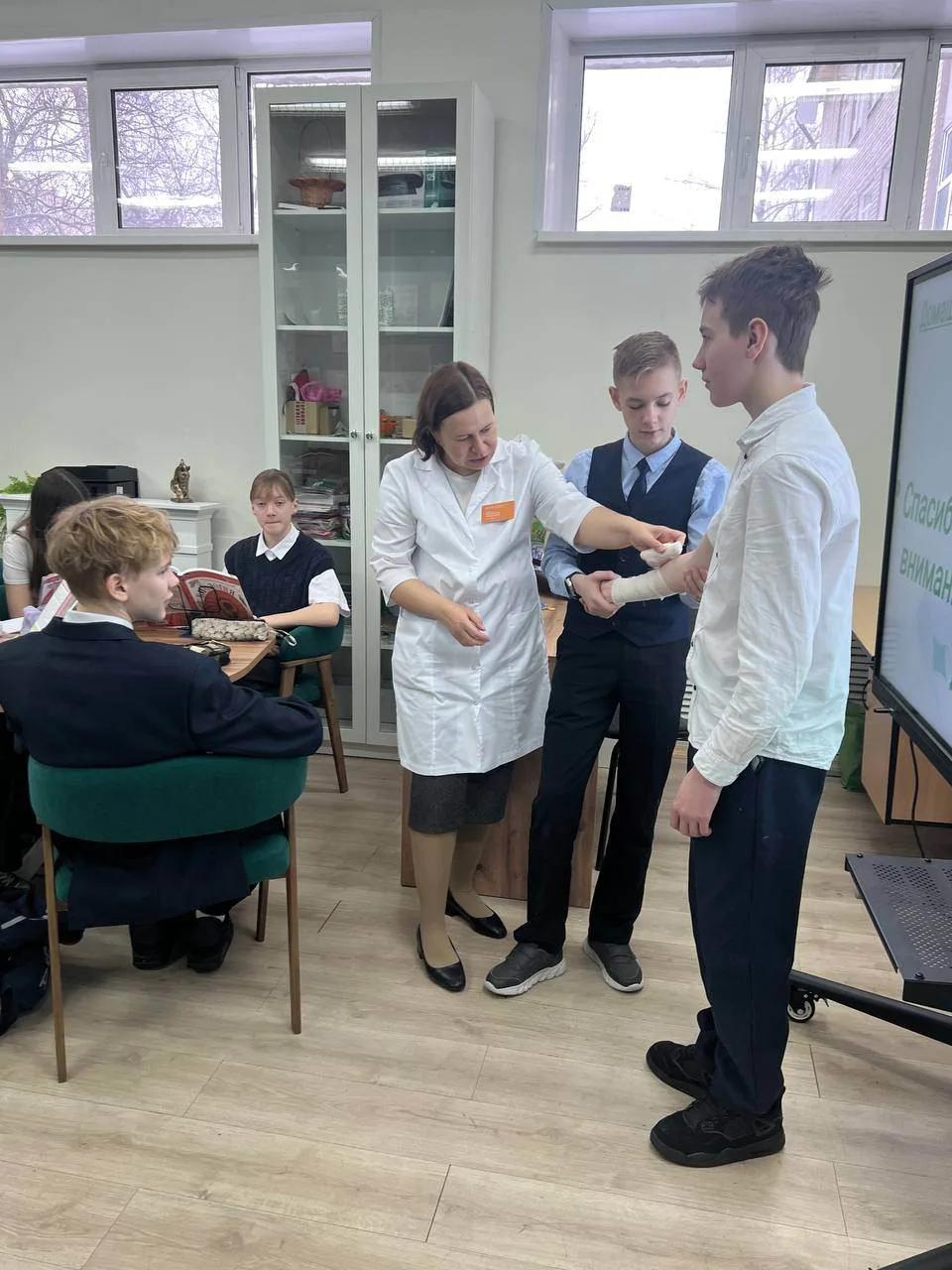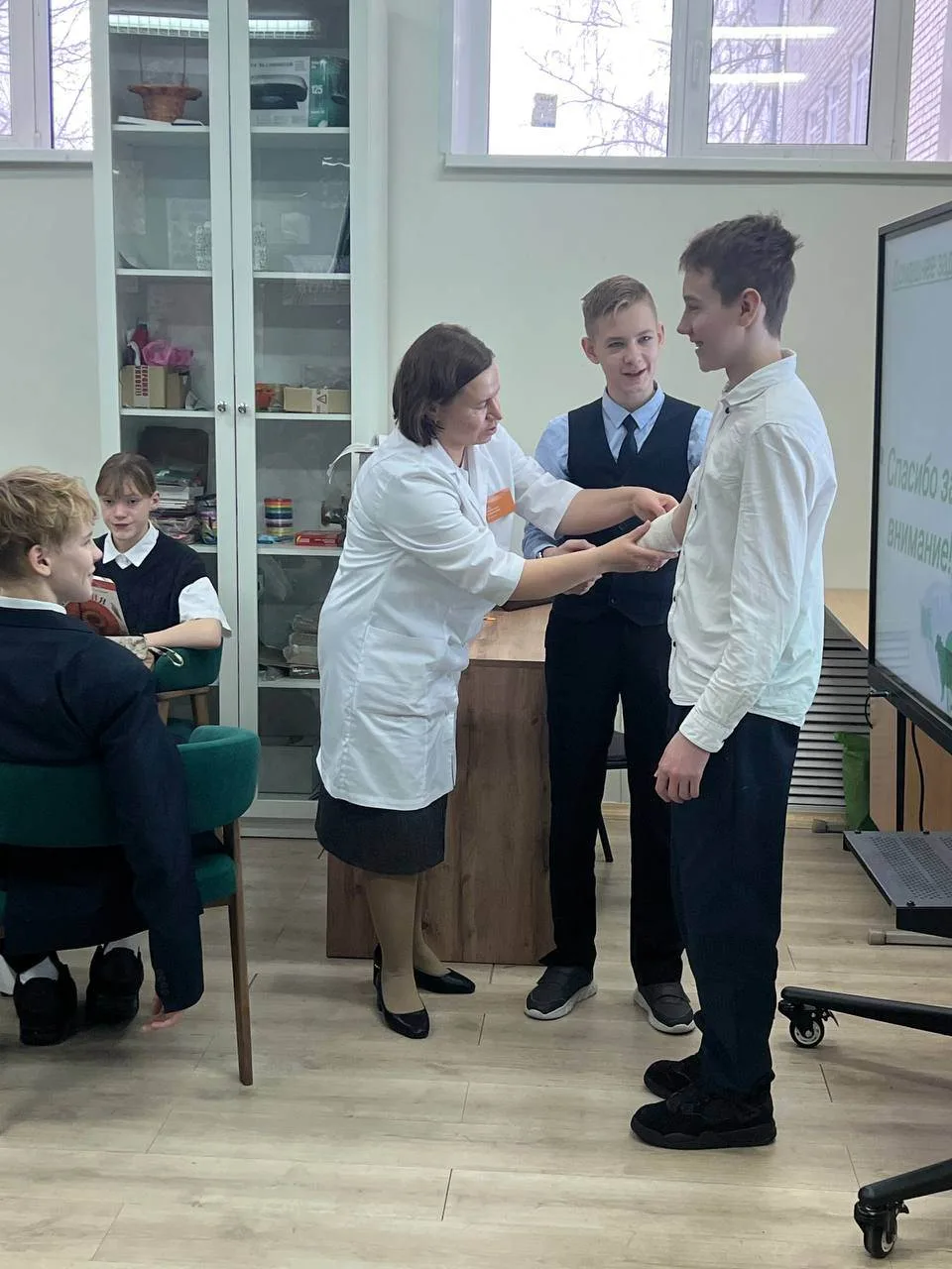 Врач продемонстрировала технику правильного наложения повязки. Это мероприятие помогло ученикам приобрести важные практические навыки, полезные в повседневной жизни.