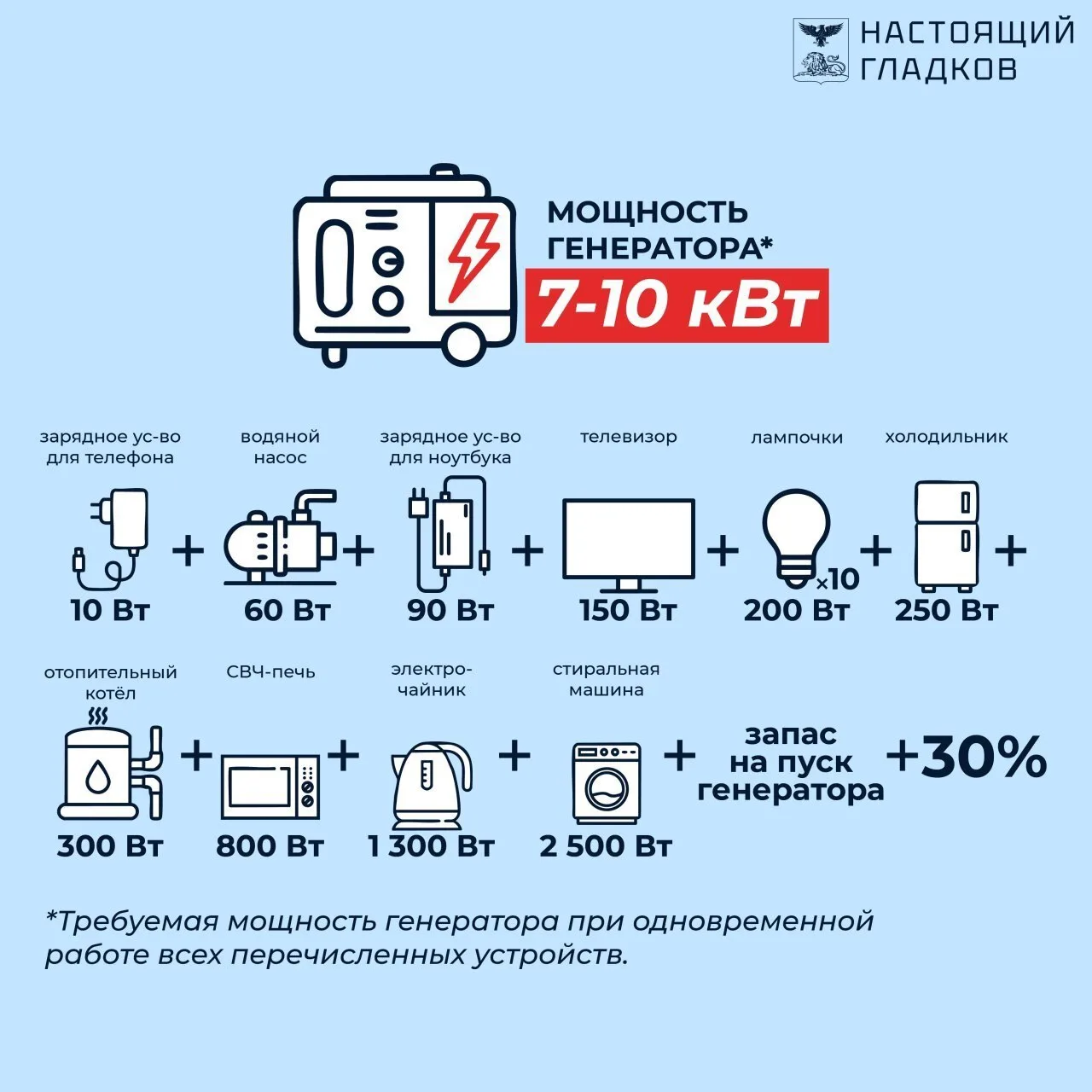 Необходимо отталкиваться из объёма потребляемой мощности и приборов, которые будут подключены к сети. Важно, чтобы суммарная мощность приборов не превышала номинальную мощность генератора.