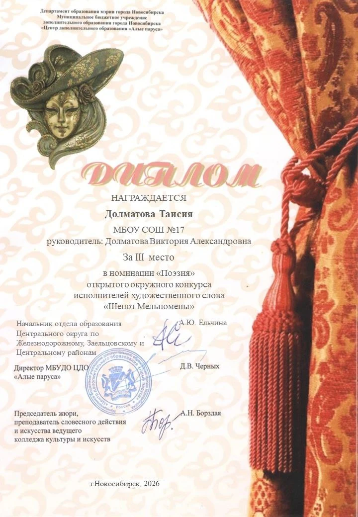 Долматова Таисия, ученица 3Б класса, приняла участие в окружном конкурсе художественного слова "Шепот Мельпомены", и заняла почетное 3 место!