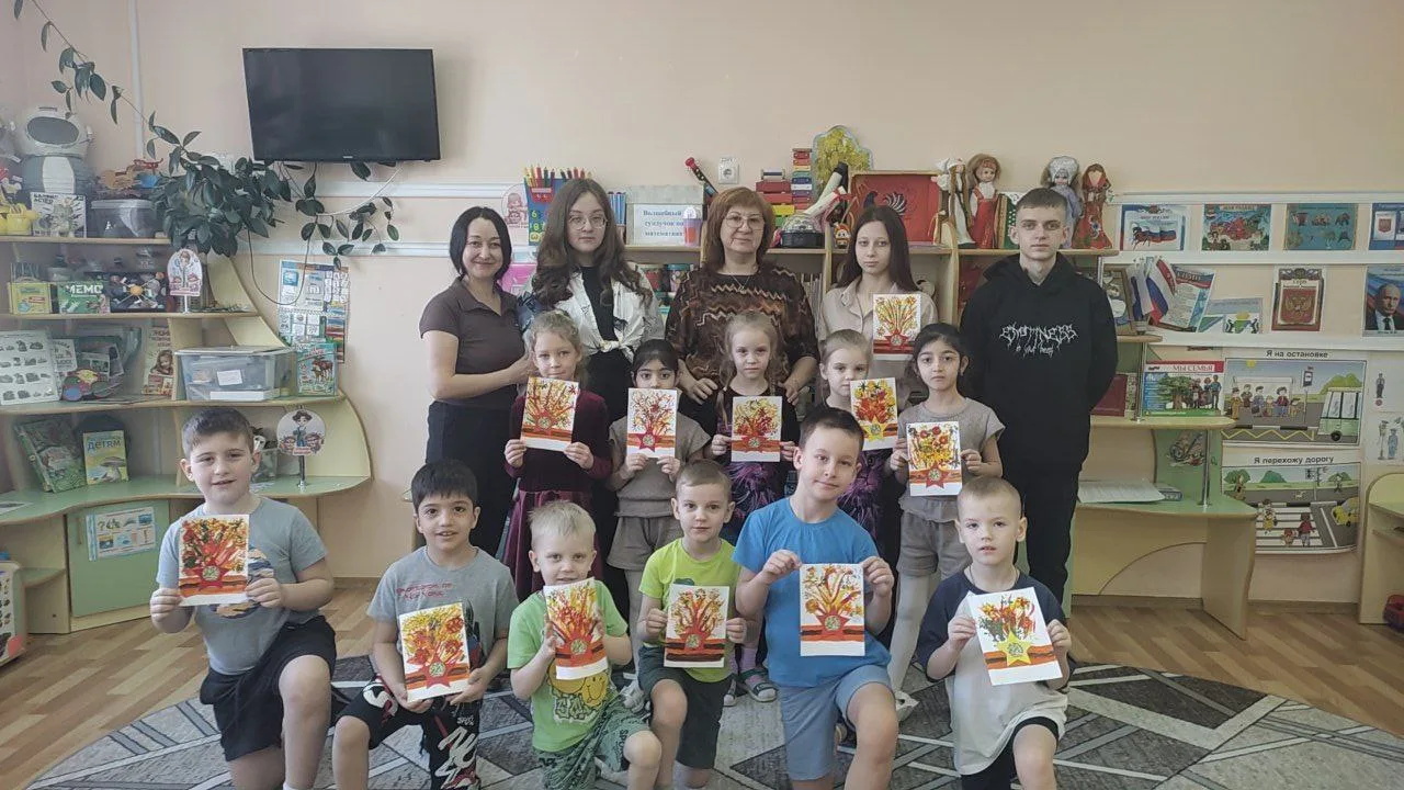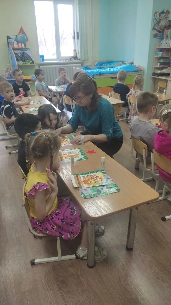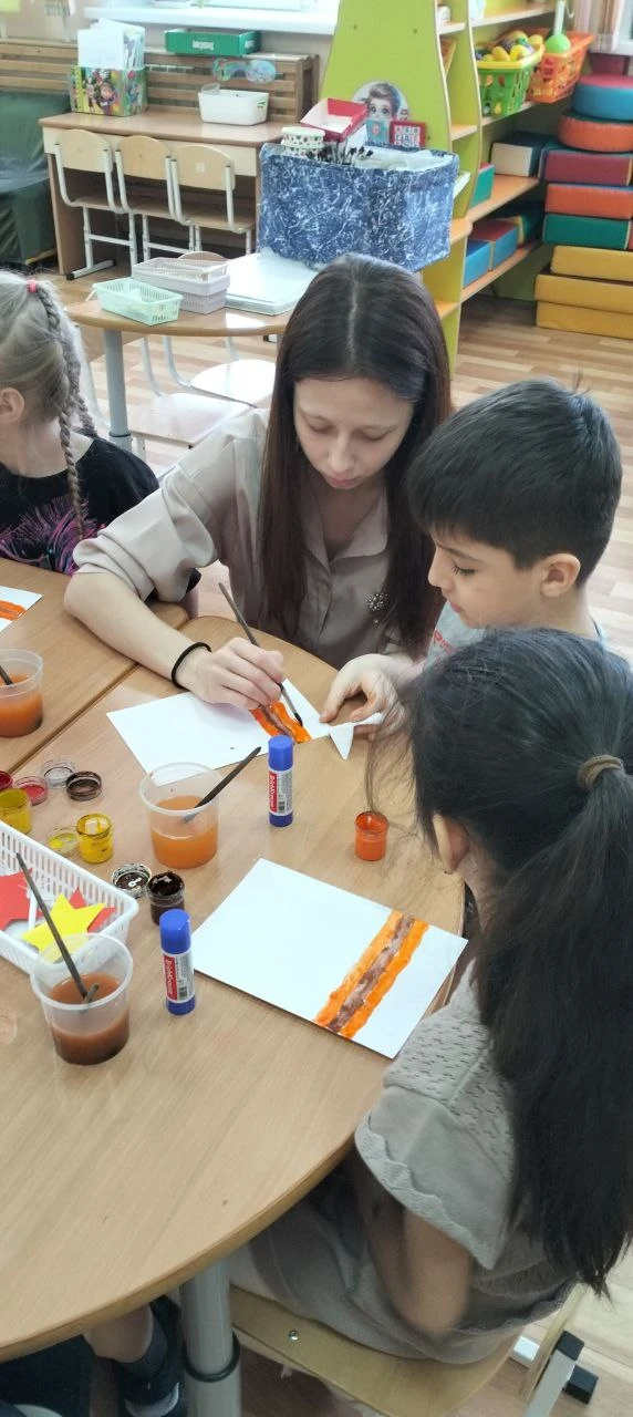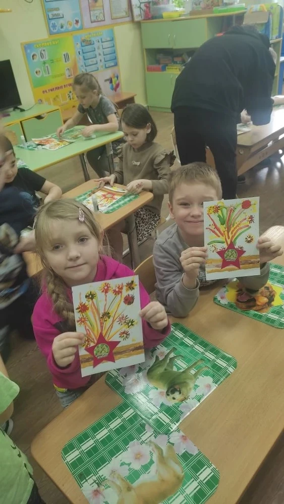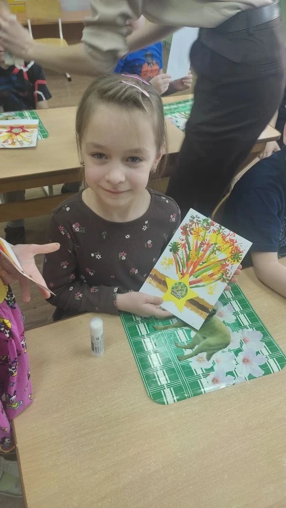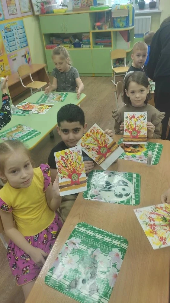 Ребята с увлечением осваивали необычную творческую технику: сочетали аппликацию с кляксографией, используя трубочки для коктейлей. Каждый ребёнок вложил частичку души в свою работу — открытки получились по‑настоящему особенными!