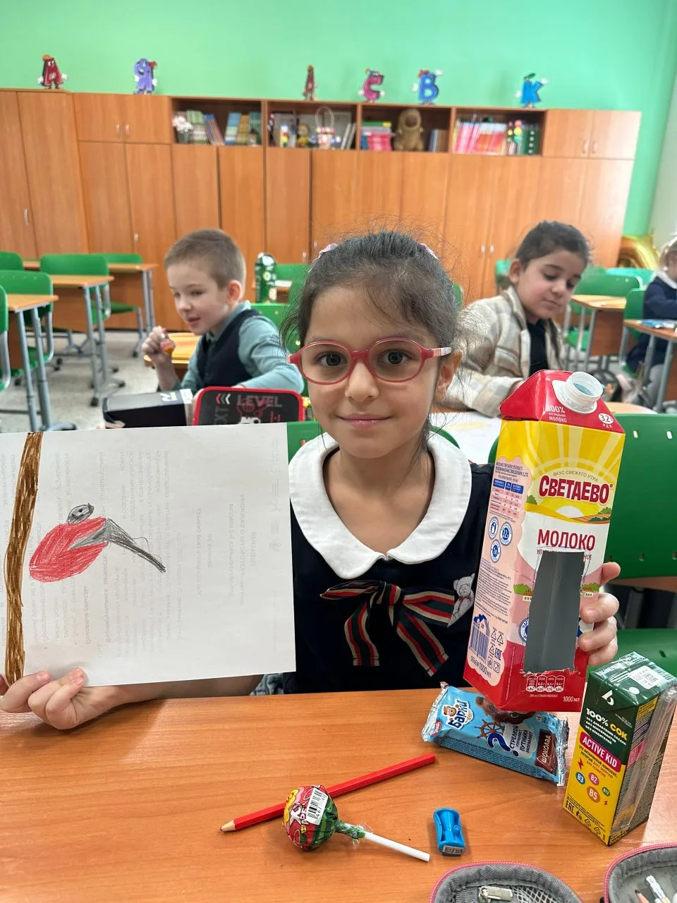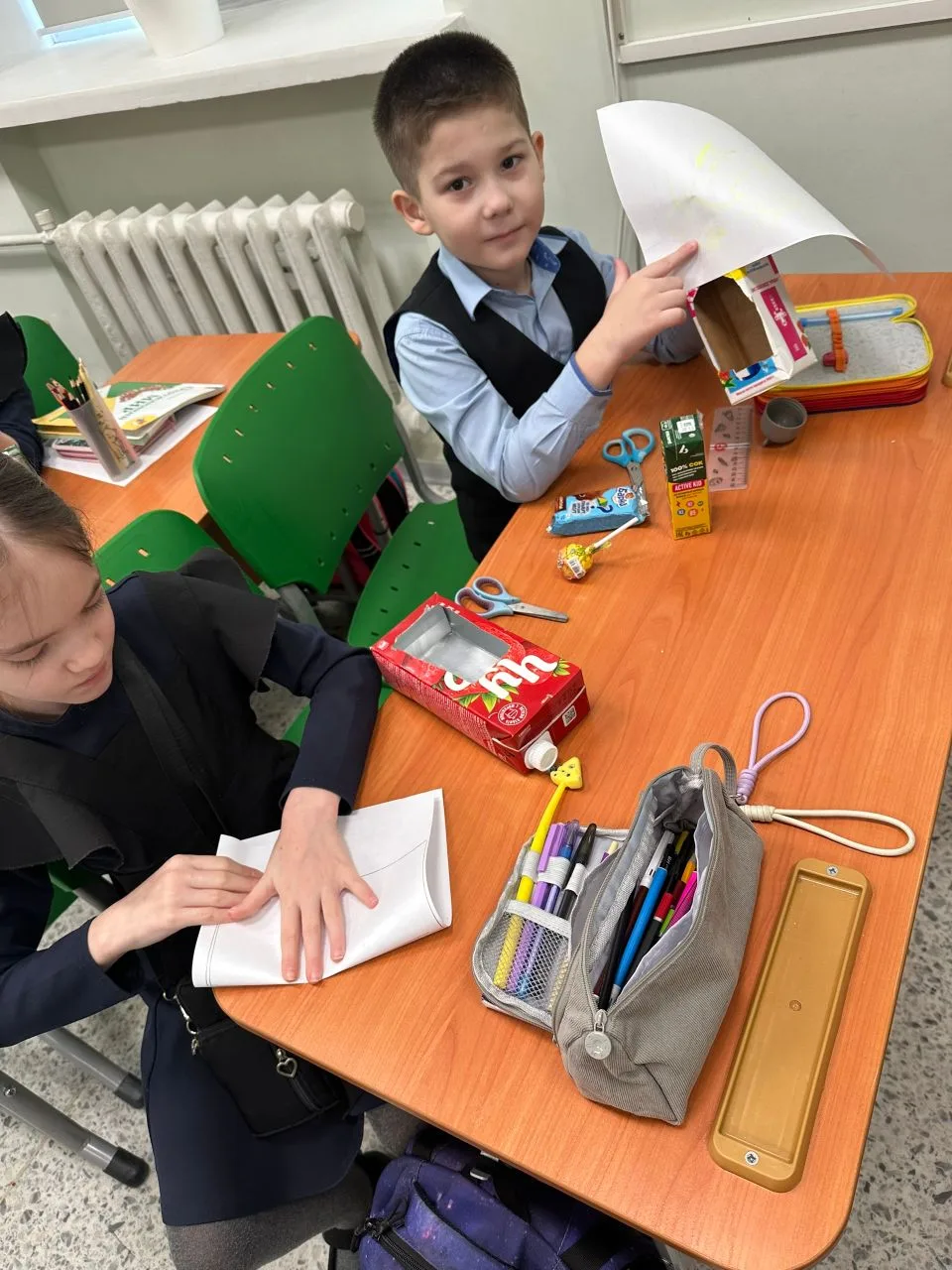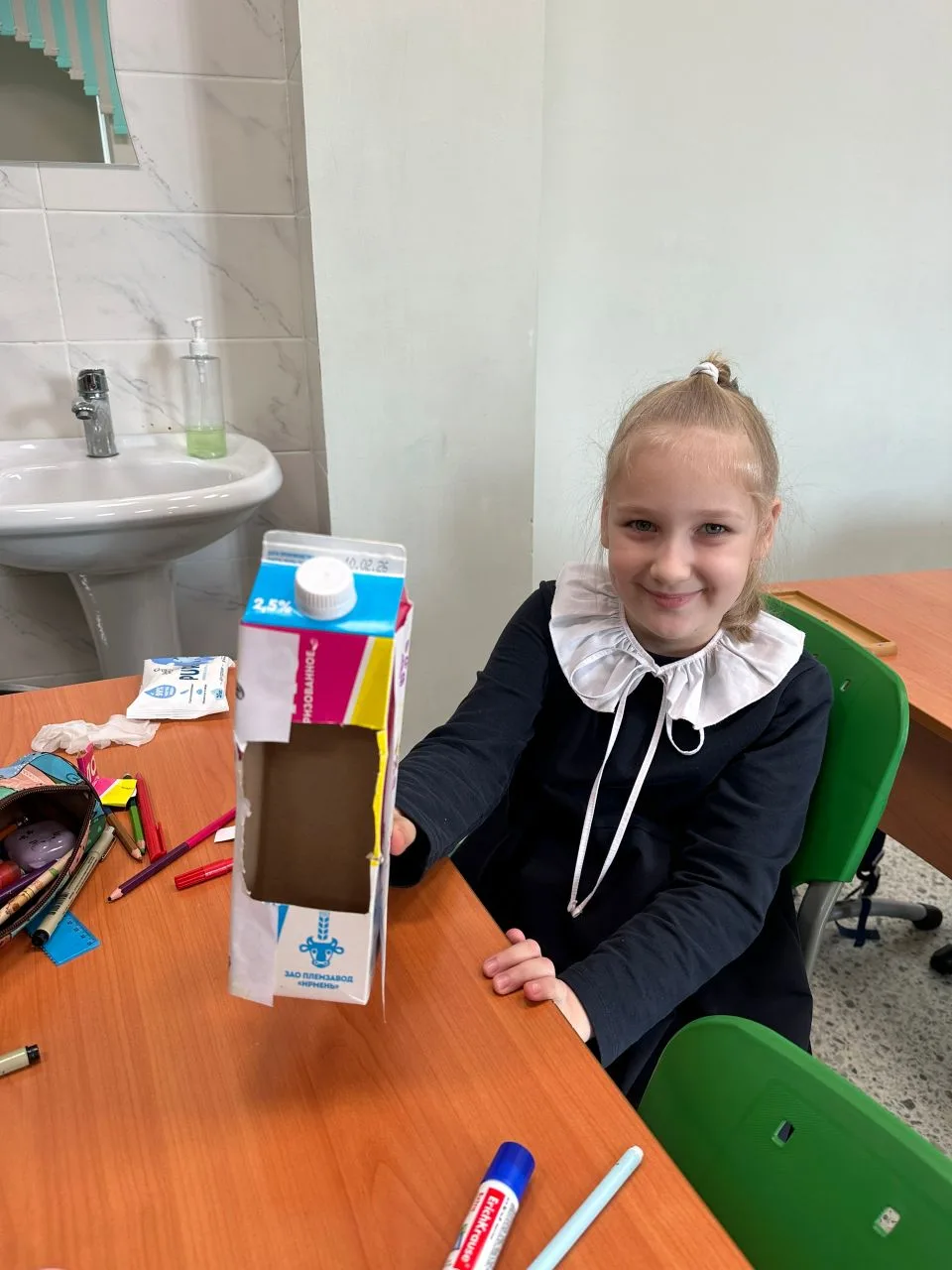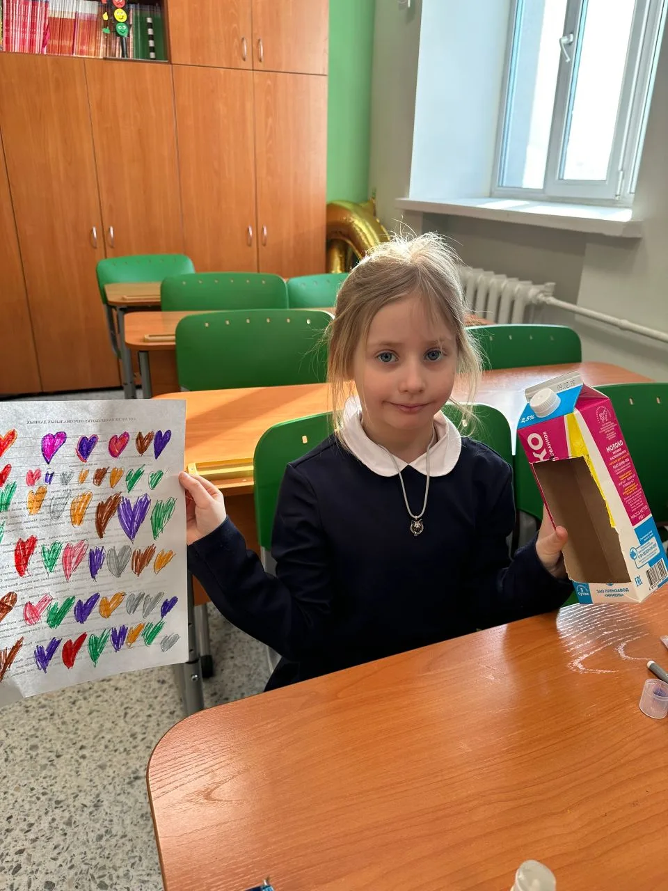 Ученики 1 В класса в рамках трека «Орлёнок‑доброволец» программы «Орлята России» сделали кормушки для птиц — из использованных тетрапаков! А потом развесили их на улице.