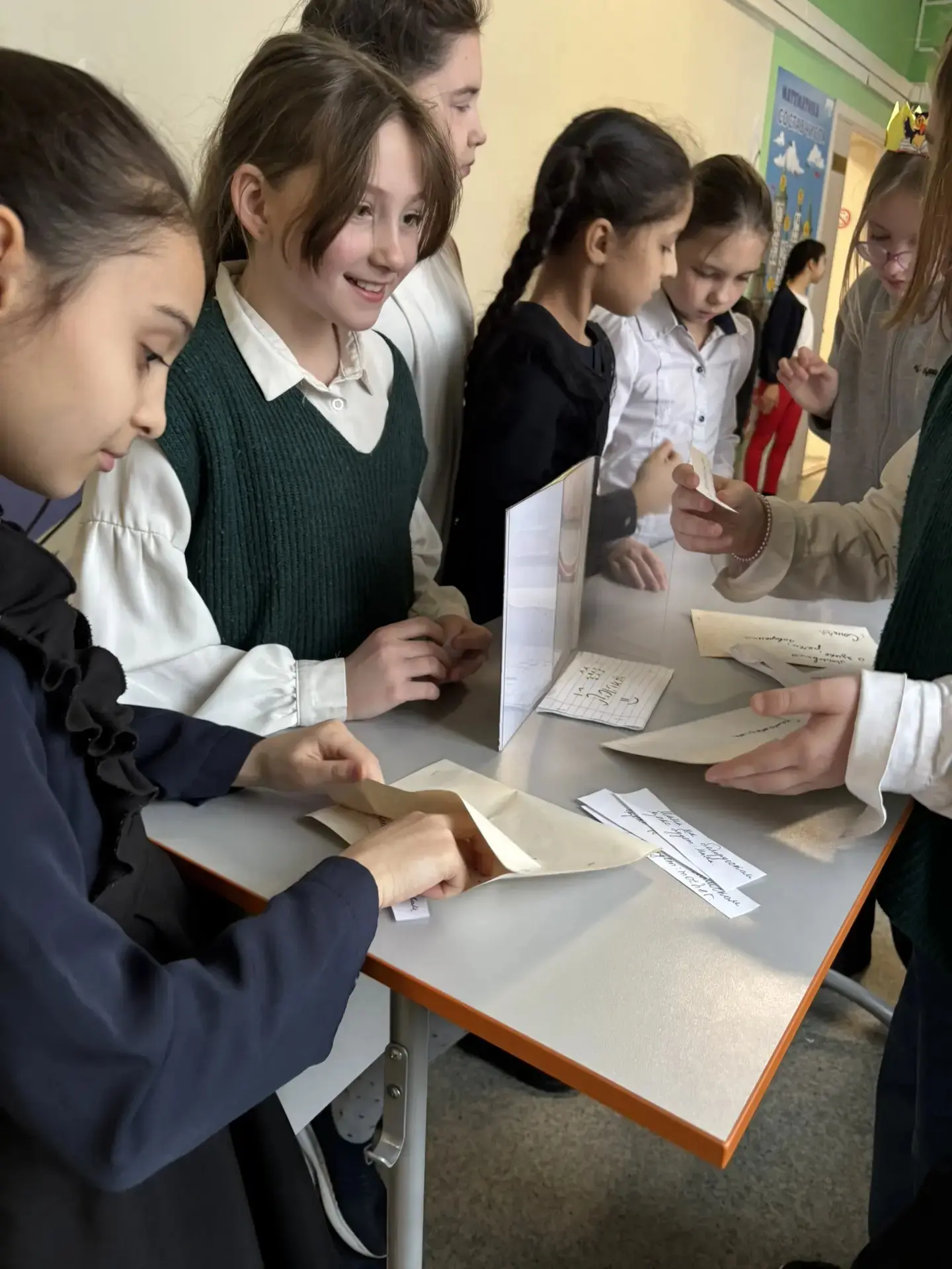 Учитель изобразительного искусства Юлия Николаевна вместе с Настей и Валерией из 8 «А» класса помогли детям создать поздравительные открытки‑аппликации — трогательные подарки для мам и бабушек.