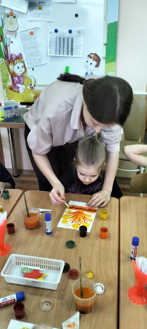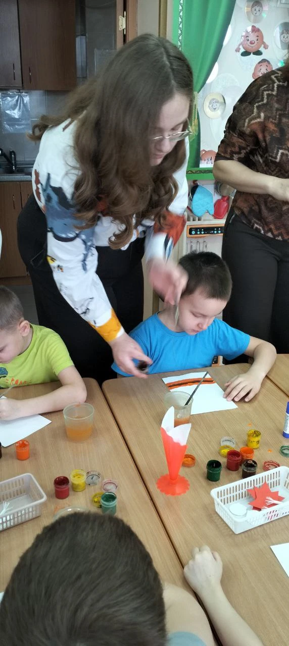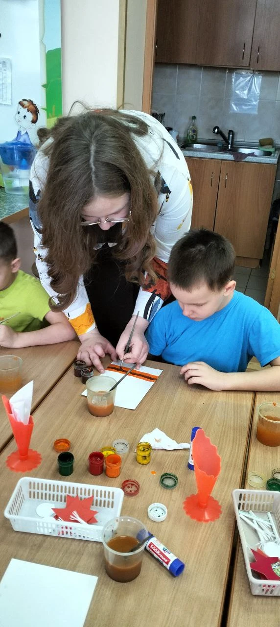 Занятие провела Юлия Николаевна Струлёва — учитель изобразительного искусства МАОУ СОШ № 77. Юлию Николаевну поддержали юные помощники — старшеклассники Майя и Дима из 11‑го класса.