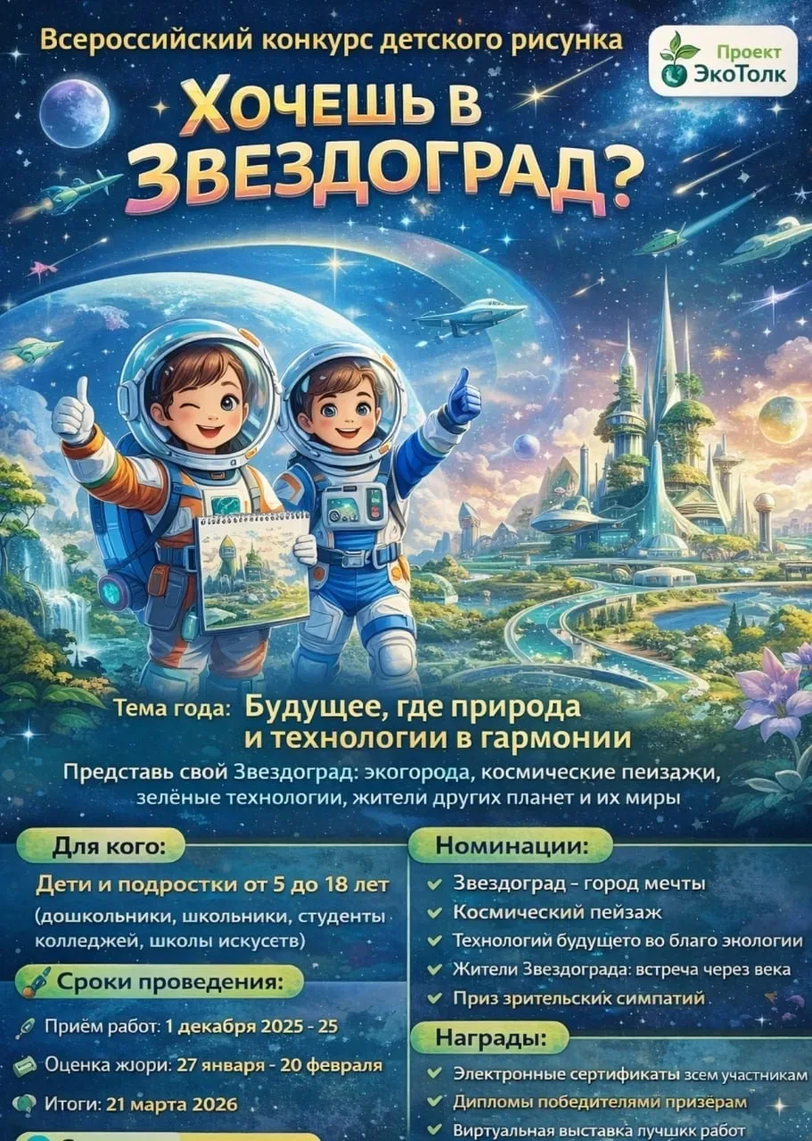 Ассоциация «ЭкоТолк» приглашает школьников и воспитанников детских учреждений к участию во Всероссийском конкурсе рисунков, посвящённом экологии, космосу и будущему 🌍🚀