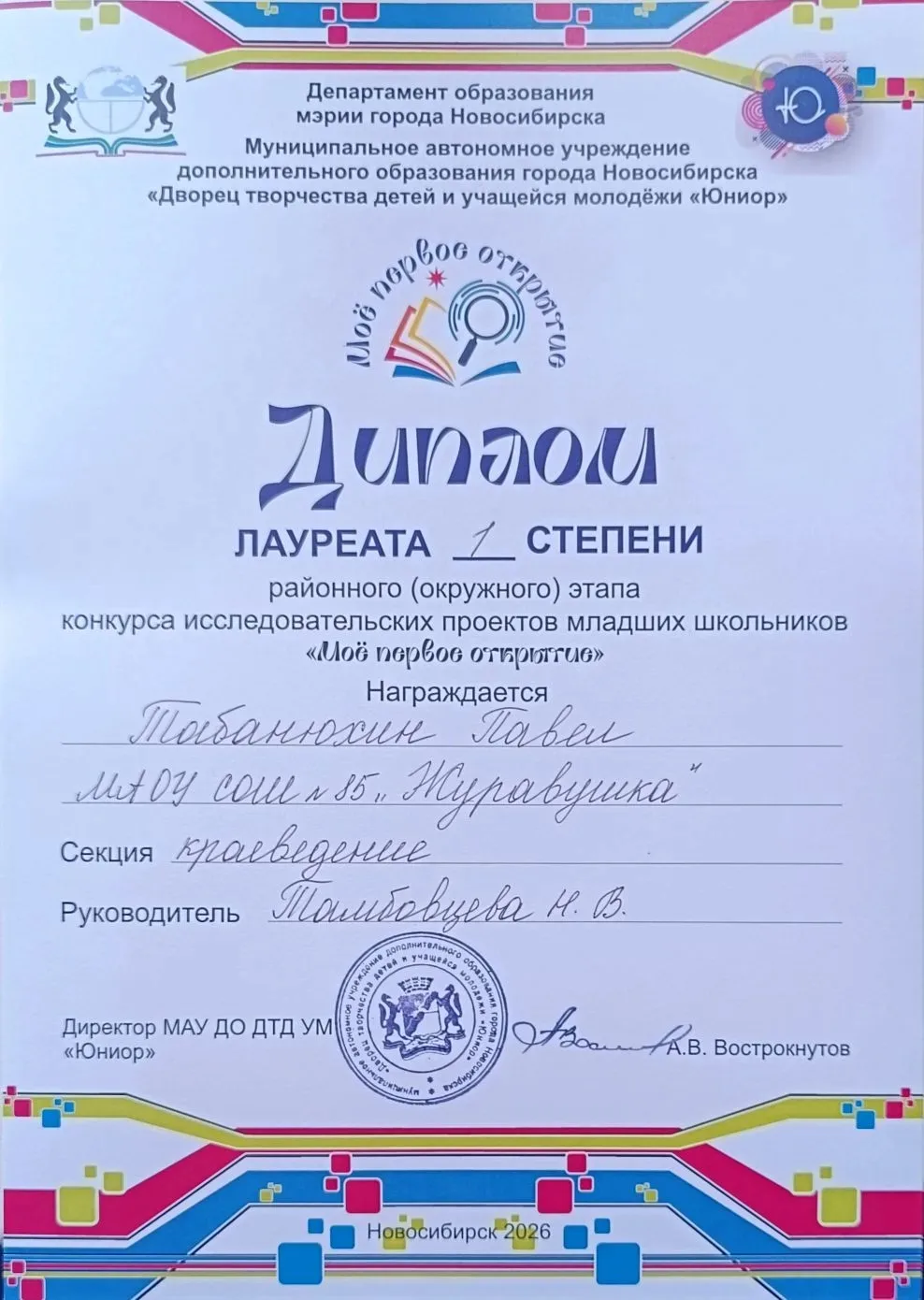 Наш журавленок Павел из 3 «Б» класса стал лауреатом I степени🏅 районного (окружного) этапа конкурса исследовательских проектов младших школьников «Моё первое открытие». 🔎 📓