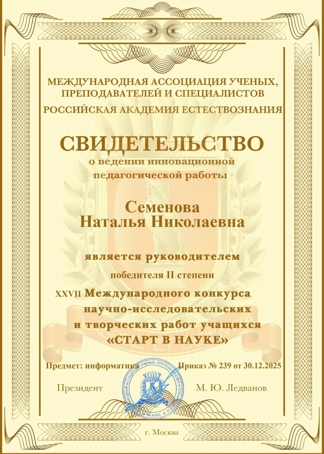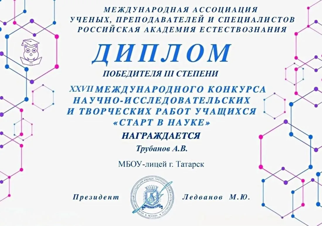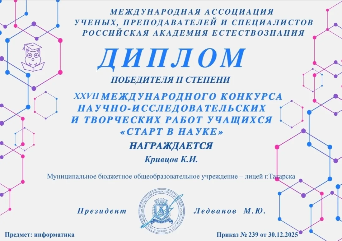 Татарский муниципальный округ по праву гордится блестящим успехом своих юных исследователей! На XXVII Международном конкурсе исследовательских и творческих проектов «Старт в науку» все три призовых места завоевали обучающиеся МБОУ-лицея города Татарска. Этот потрясающий результат демонстрирует высочайший уровень подготовки, талант и целеустремленность ребят лицея. Все трое победителей приглашены на очный этап конкурса, который пройдёт в Москве с 7 по 10 апреля 2026 года в ГК «Измайлово».