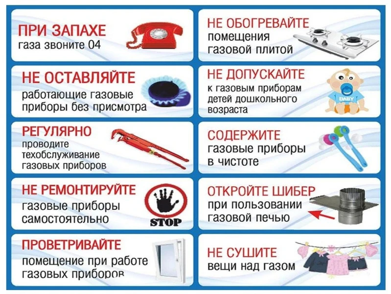 Если почувствовали запах газа – не зажигайте огонь, не курите, не пользуйтесь электроосвещением и электроприборами. Немедленно прекратите использование газовых приборов, перекройте краны к приборам и на них, откройте окна или форточки, покиньте помещение и вызовите аварийную газовую службу по телефону 104.