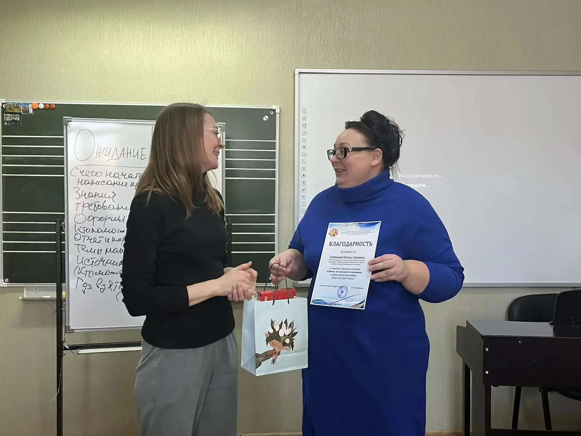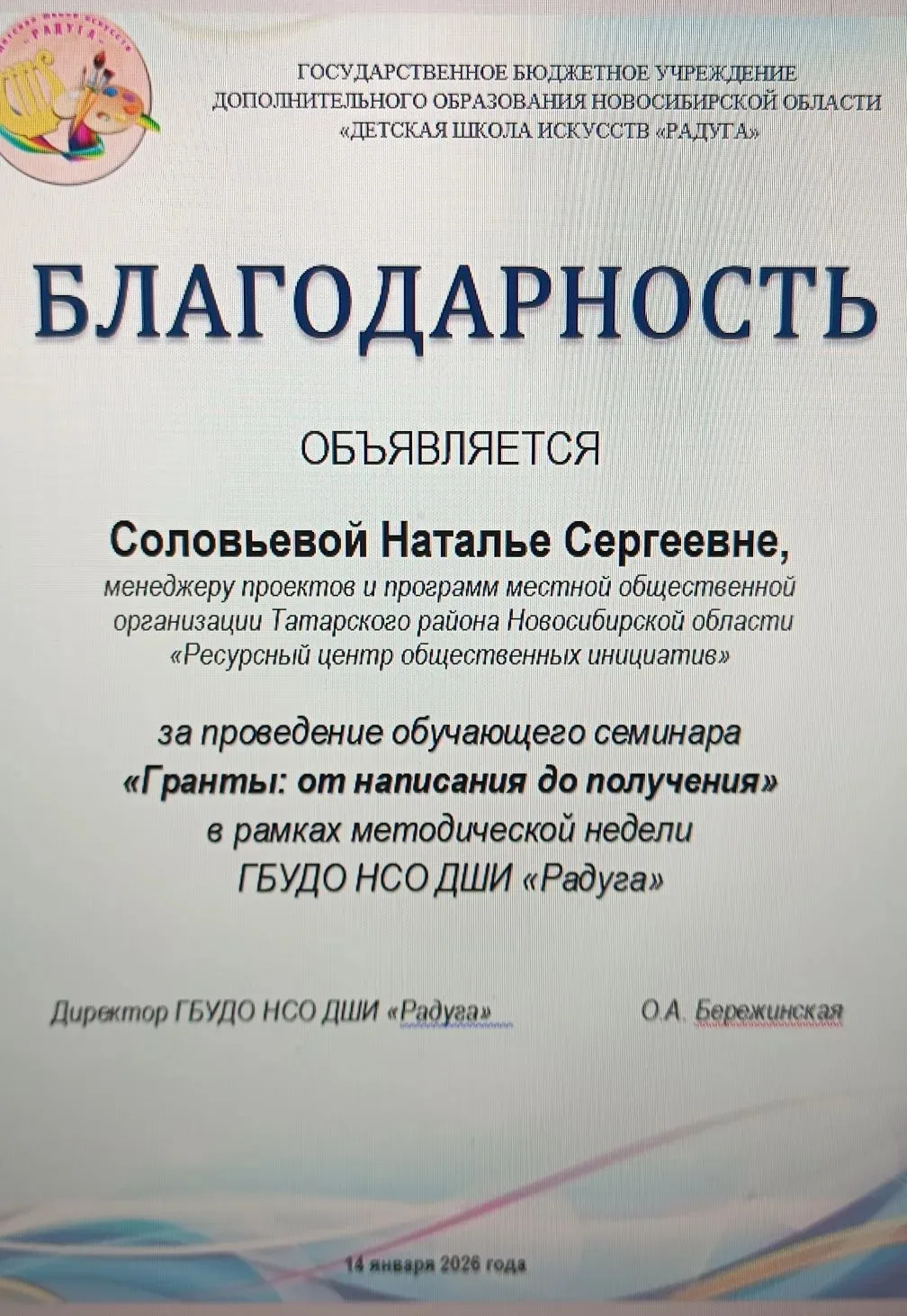 14 января на базе детской школы искусств «Радуга» менеджер проектов и программ Ресурсного центра общественных инициатив Наталья Соловьева провела обучающий семинар «Гранты: от написания до получения».