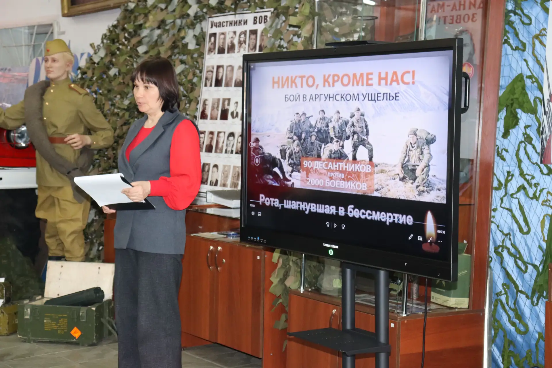 Ребята узнали, как 26 лет назад 90 псковских десантников приняли неравный бой с чеченскими боевиками и арабскими наемниками и преградили путь террористам, пытавшимся прорваться из Аргунского ущелья в Дагестан. Подвиг солдат и офицеров на высоте 776 навсегда вошёл в историю России как символ высочайшего мужества, несгибаемой стойкости, патриотизма и верности присяге.