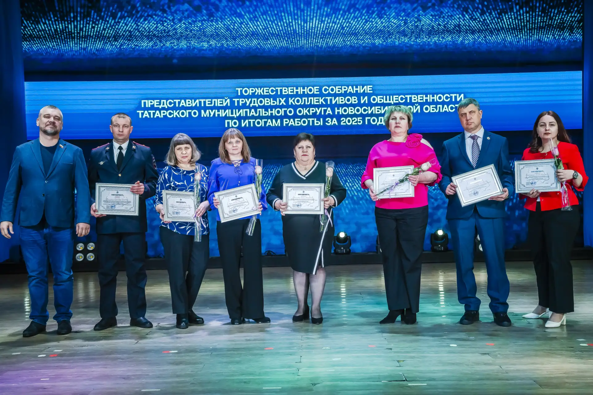 В составе хора: сотрудники межмуниципального отдела МВД России "Татарский", отряды движения "Орлята России" детских садов № 1, 6, 7 г. Татарска, кадетские и юнармейские классы школ № 3, 4, 9 и лицея г. Татарска, творческие коллективы и артисты г. Татарска.