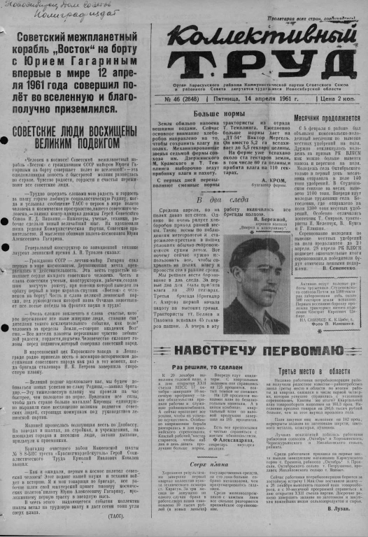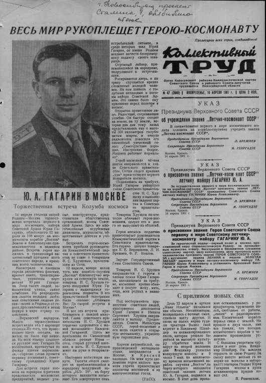 📰Вспомним газетные строки: что писала районная газета тех лет о первом полете человека в космическое пространство?