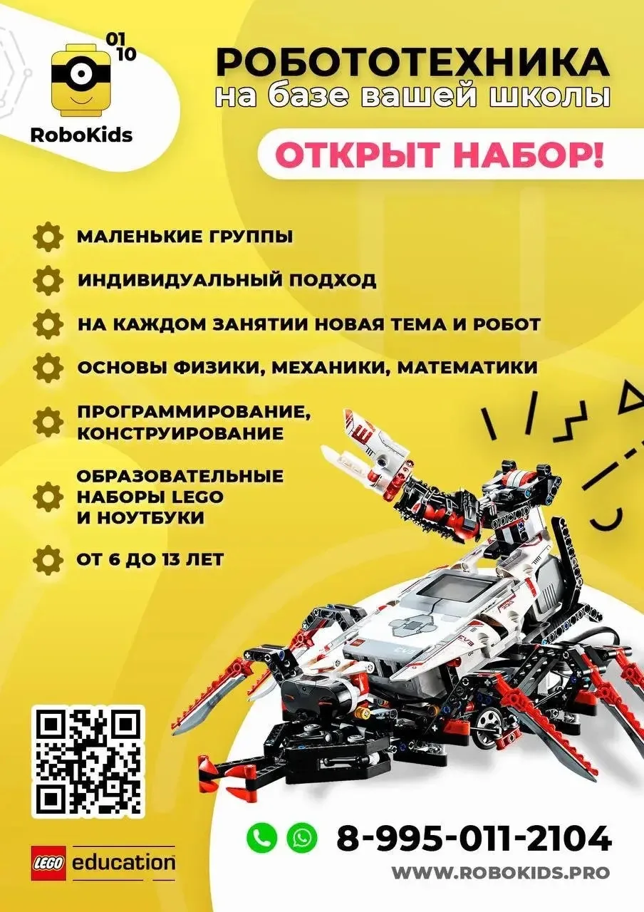 Приглашаются дети с 1️⃣ по 4️⃣ классы. Занятия будут проходить в будние дни. Длительность одного занятия 2 часа, на каждом занятии дети собирают и программируют нового робота🤖