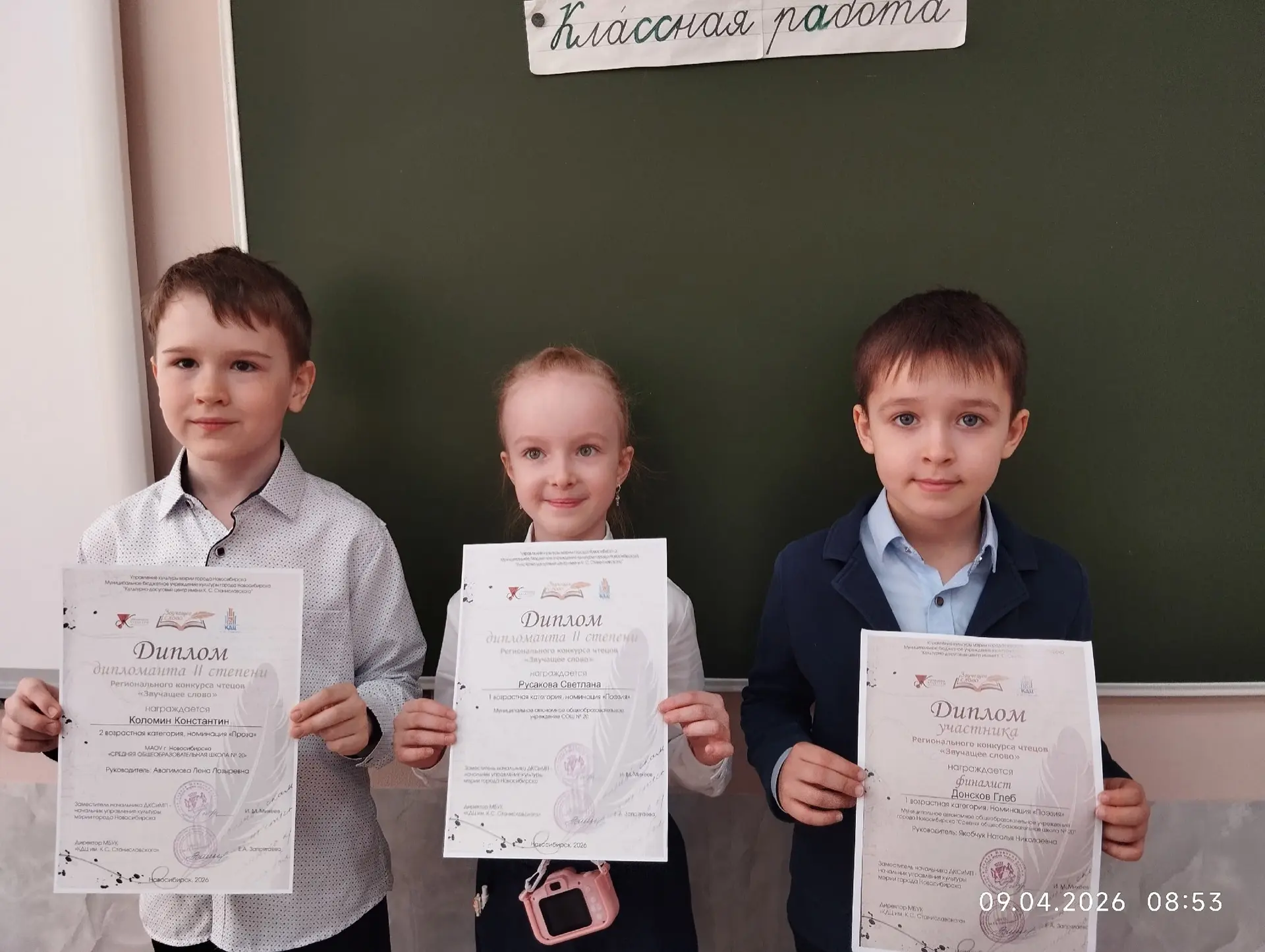 И вот Дипломом участника Регионального конкурса чтецов "Звучащее слово" награждён Финалист Донсков Глеб 1б, дипломантами II степени стали Коломин Константин 2б и Русакова Светлана 1в. Поздравляем ребят!!!