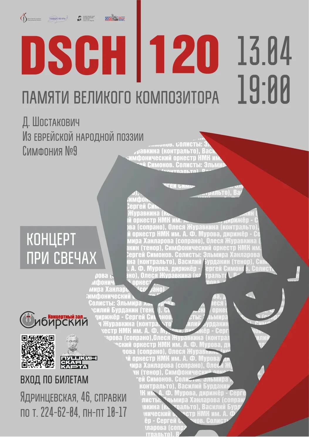 Концерт открывает серию мероприятий уже популярного тренда «При свечах»! В преддверии 120-летия со дня рождения Дмитрия Шостаковича симфонический оркестр НМК им. А.Ф. Мурова (дирижер – Сергей Симонов) представит вниманию слушателей концертную программу. Для вас прозвучат вокальный цикл «Из еврейской народной поэзии» и симфония №9 Дмитрия Шостаковича. Солисты – Эльмира Ханларова (сопрано), солистка НГФ Олеся Журавкина (меццо-сопрано), солист НОВАТа Василий Бурдакин (тенор).