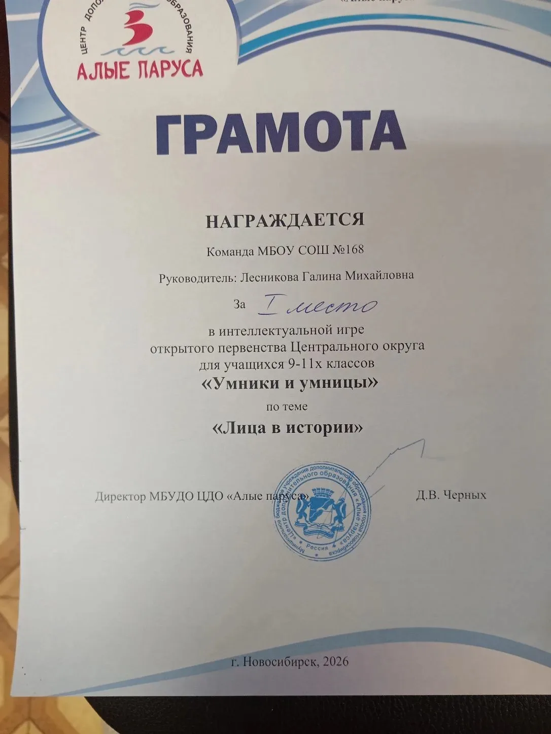 🧐 Приняла участие в интеллектуальной игре открытого первенства Центрального округа для учащихся 9-11-х классов «Умники и умницы» по теме «Лица в истории»