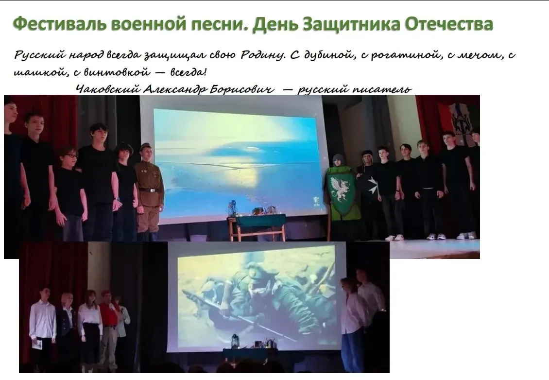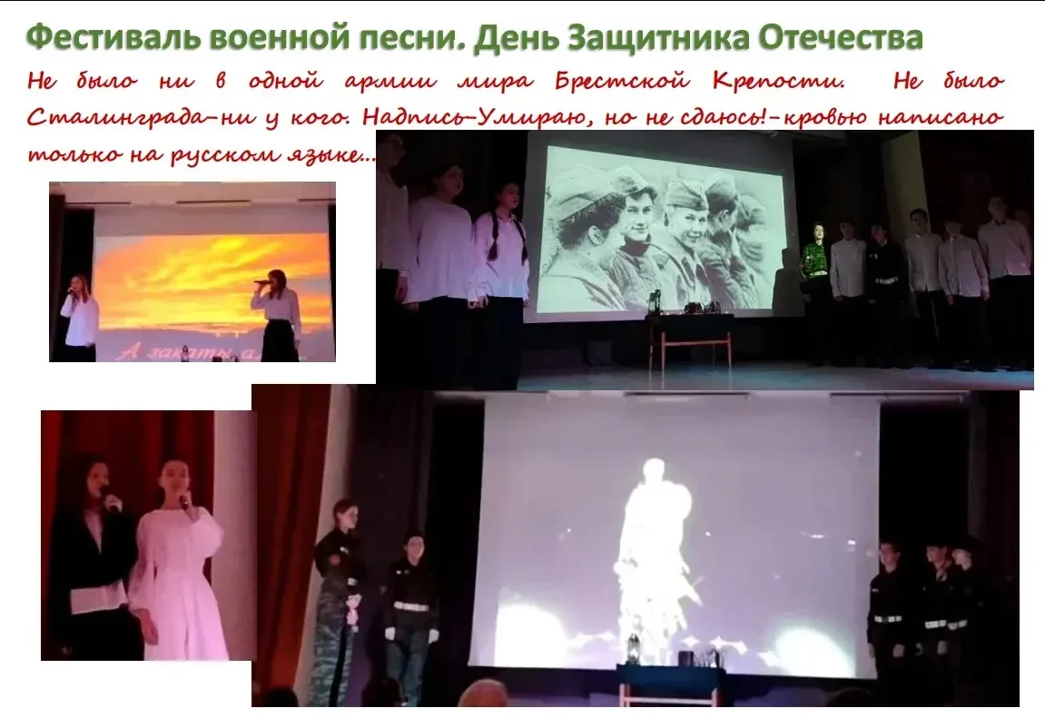 🪖В преддверии Дня защитника Отечества, 20 февраля, актовый зал нашей школы наполнился звуками мелодий, которые знают и любят миллионы. Фестиваль военной песни стал ярким и торжественным посвящением всем, кто стоит на страже нашей Родины.