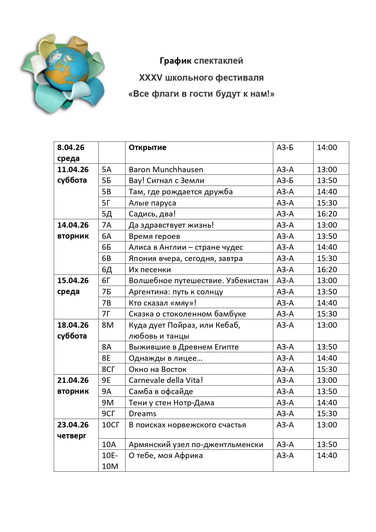 График спектаклей XXXV школьного фестиваля