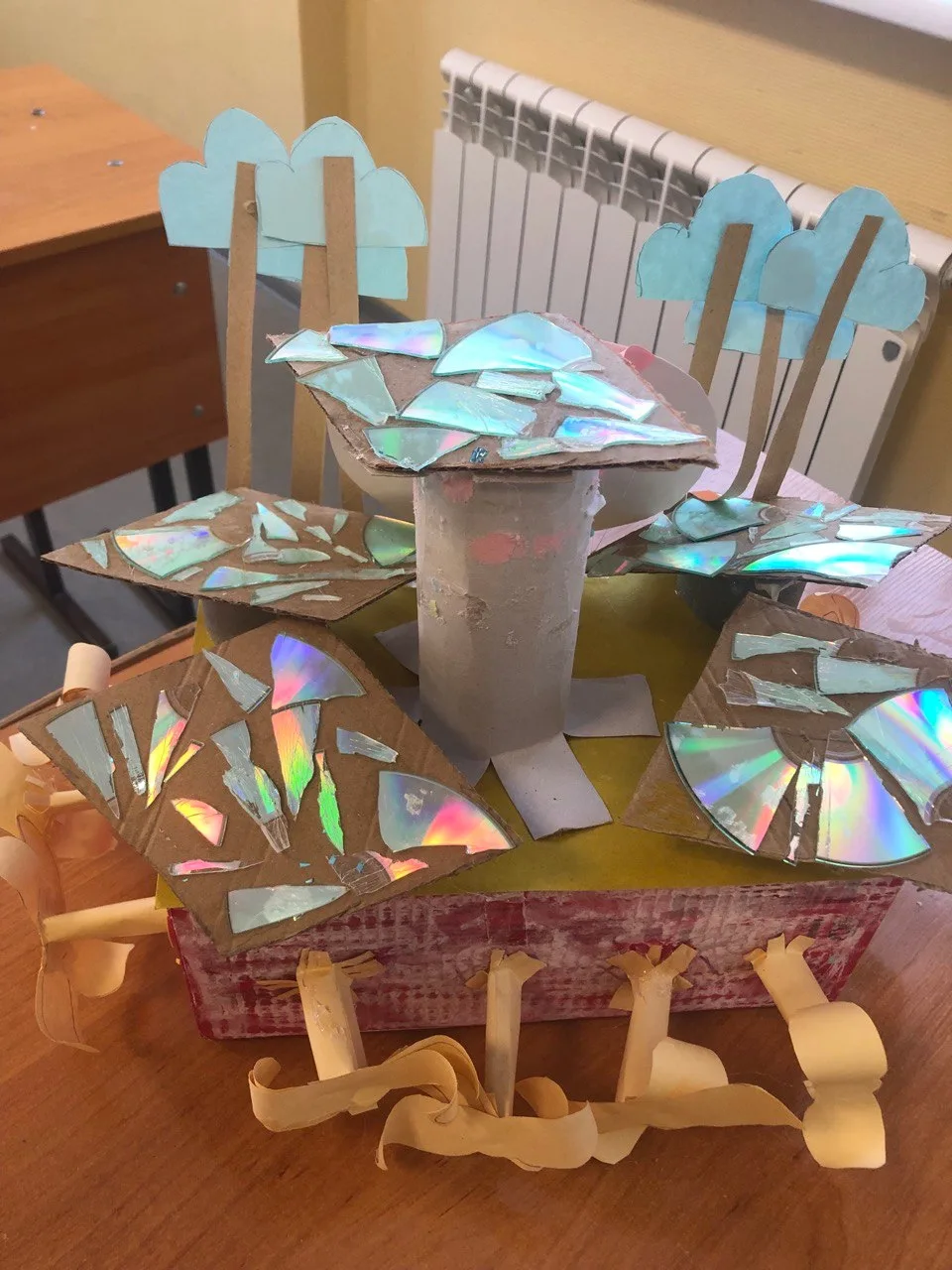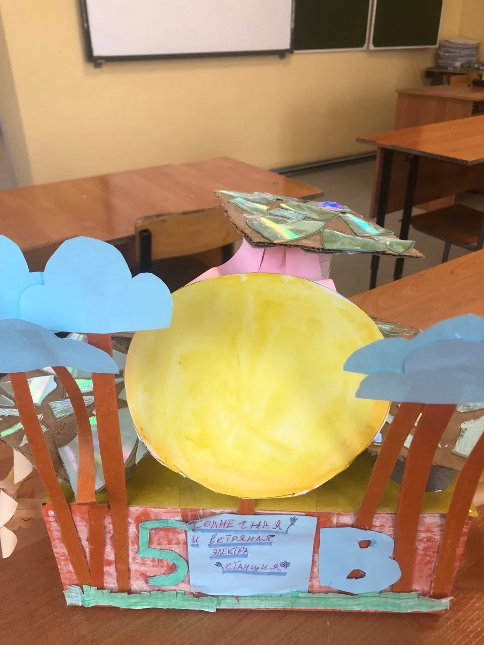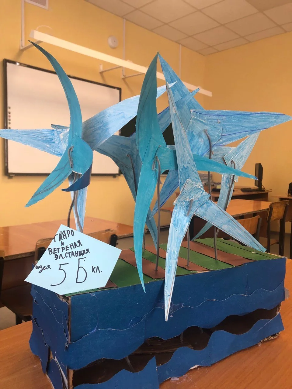 Безграничная фантазия ребят и опыт учителя помогли соорудить тепло-ветроэлектростанцию (5а класс), ветро-гидроэлектростанцию (5б класс) и солнечно-ветровую электростанцию (5в класс).