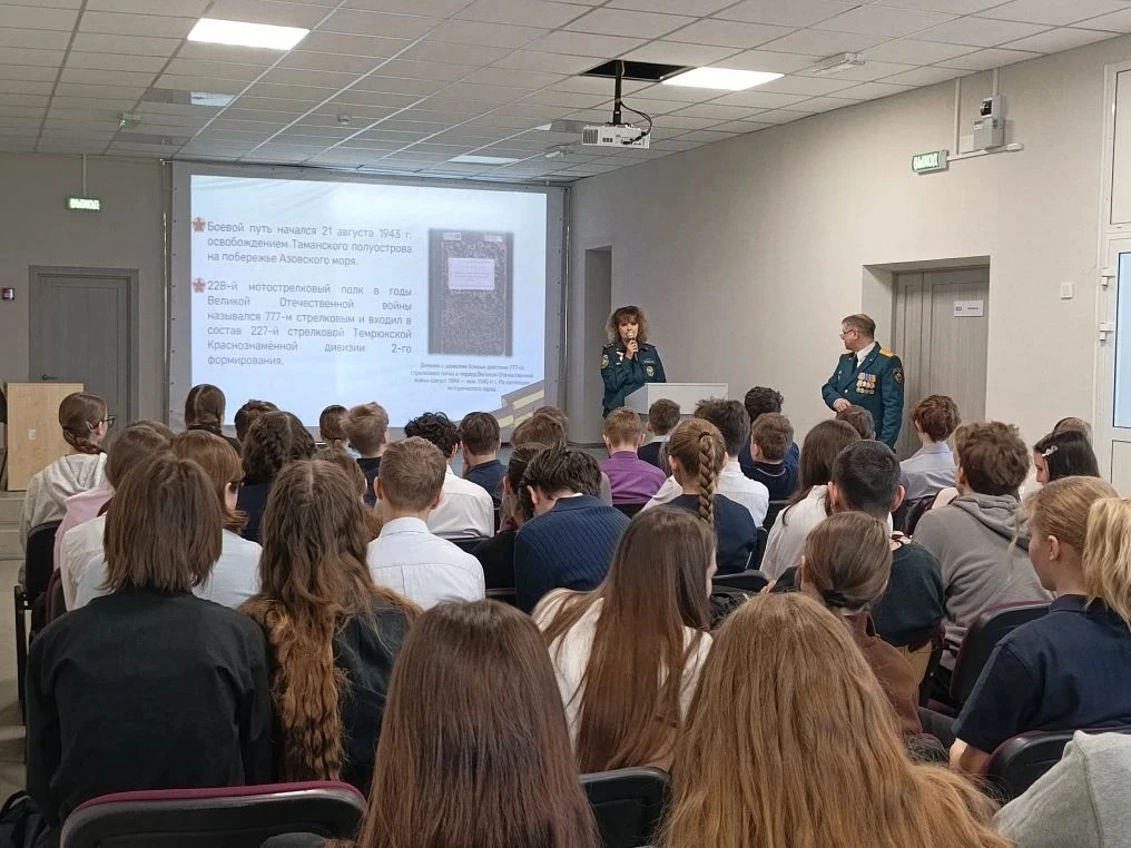 🇷🇺Сегодня, 19.02.2026г., в преддверии Дня защитника Отечества, в лицее для учеников состоялся Урок Мужества "Боевой путь 85-й стрелковой Ленинградско - Павловской Краснознаменной дивизии", проведённый сотрудниками МЧС.