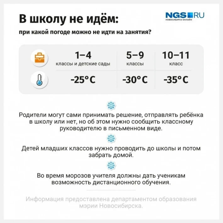 Уважаемые родители, напоминаем, что в период сильных морозов школа работает в штатном режиме. Родители вправе самостоятельно принимать решение о посещении занятий, сообщив от этом классному руководителю по телефону, а затем в письменной форме, написав заявление на отсутствие. Уроки, пропущенные по заявлению, будут считаться пропусками по уважительной причине.
