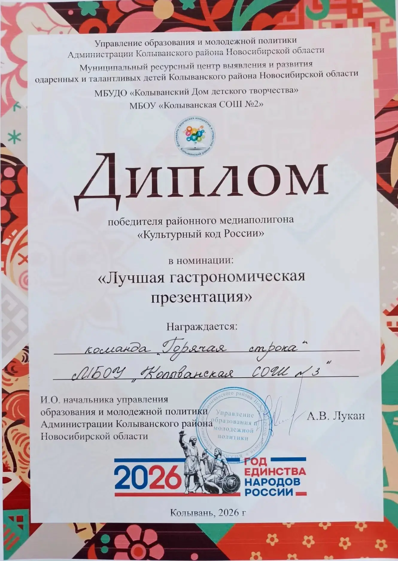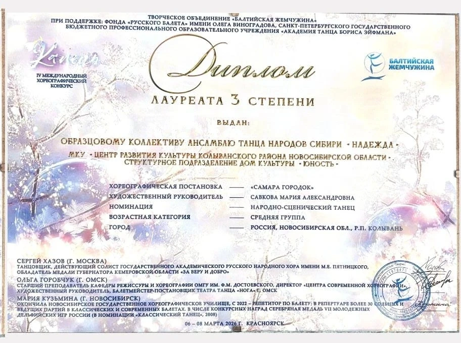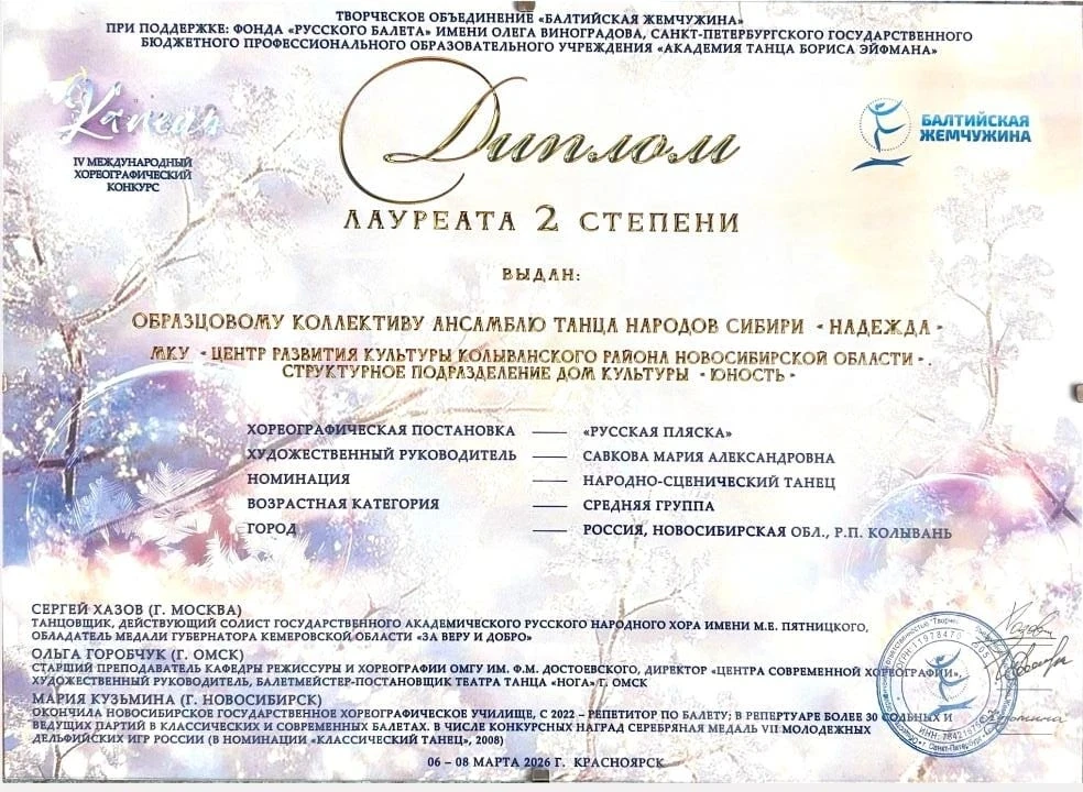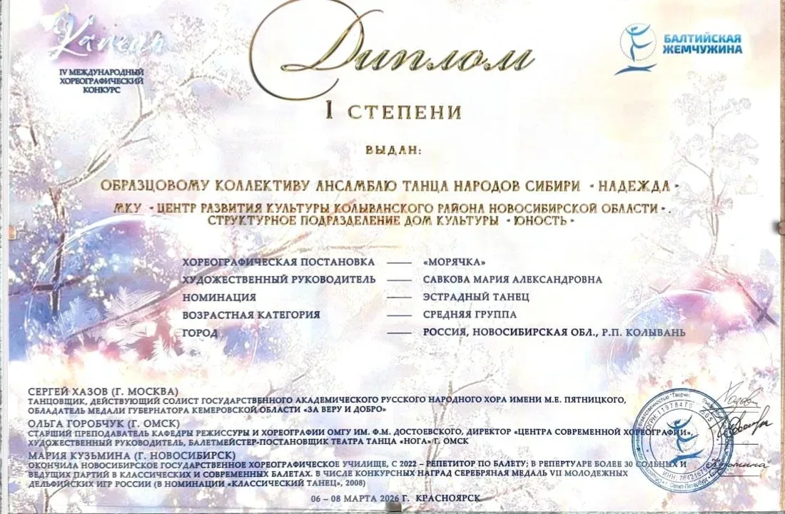 Образцовый коллектив танца народов Сибири "Надежда", который был создан руководителем Шульц А. Я., побывал в городе Красноярске на международном конкурсе "Капель", большая часть этого коллектива учащиеся нашей школы:
