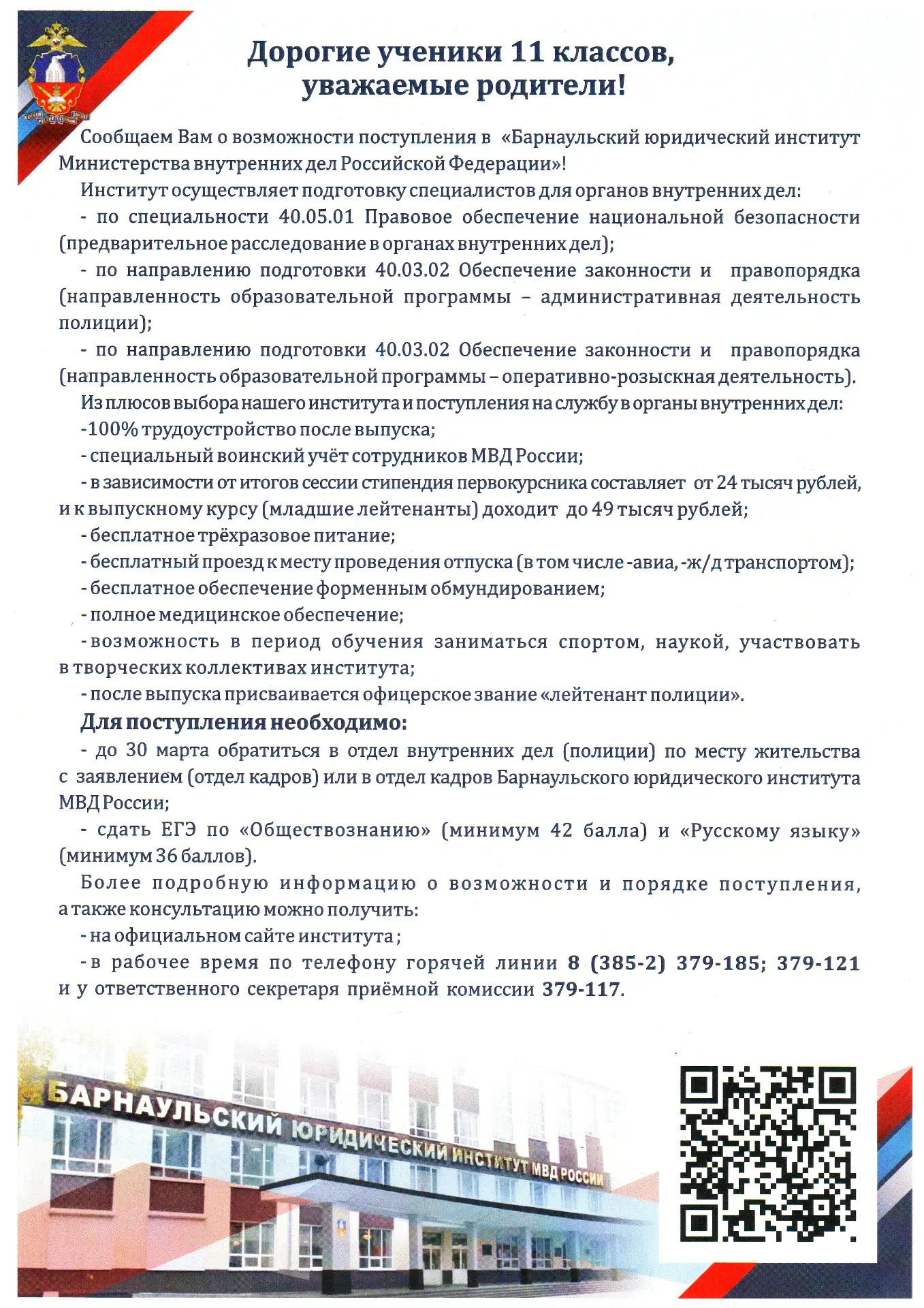 Сегодня выпускник 2025 года, Кобзев Константин, вернулся в родную школу, чтобы рассказать ребятам старших классов о своей учебе в Барнаульском юридическом институте МВД России. Костя рассказ о преимуществах службы в органах внутренних дел, а также о способах поступления в институт.