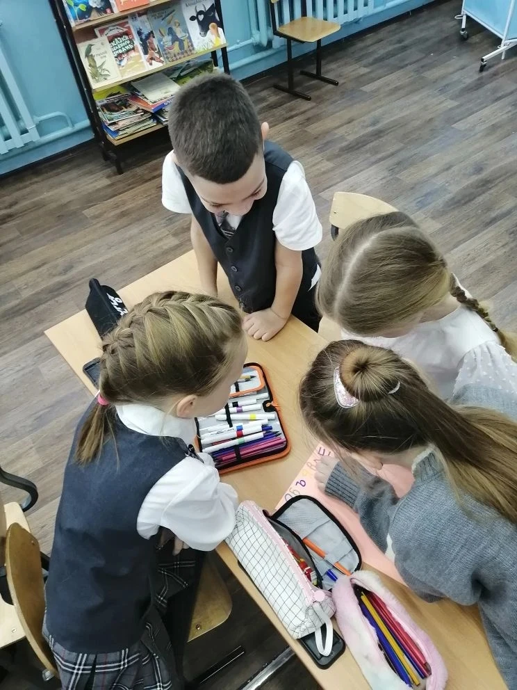 Ребята работали в группах над темой "Виды текстов. Учимся писать объявление". Это было первое занятие подобного формата, хотя раньше детям уже приходилось сотрудничать друг с другом.