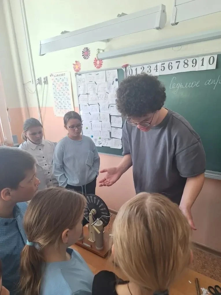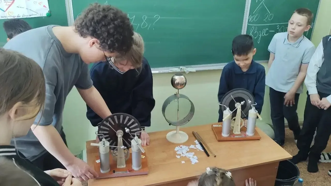Ребята познакомились со статическим электричеством: заставили воздушные шары «прилипать» к стенам, а волосы — вставать дыбом ⚡. Юные исследователи с восторгом наблюдали за работой электрофорной машины и электрометра, узнав, как «живёт» электричество в приборах 🔍.