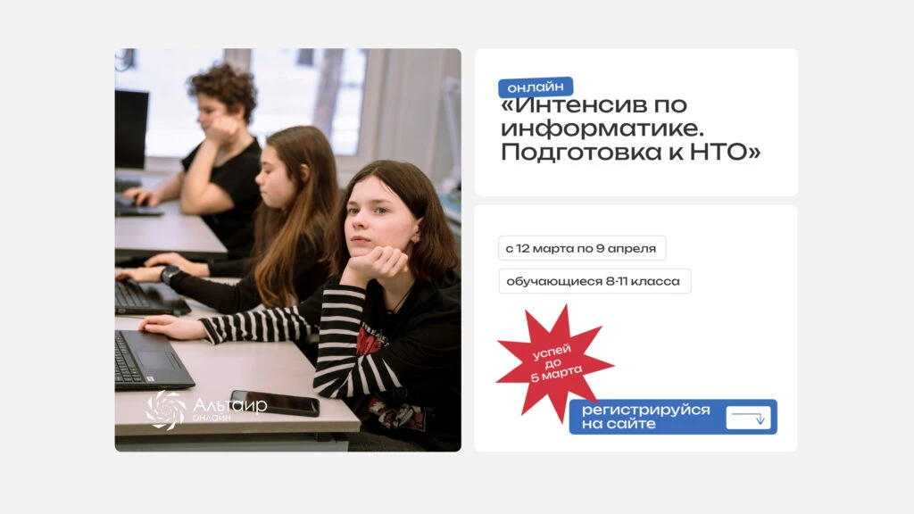 Приглашаем обучающихся 8—11 классов на образовательный курс «Интенсив по информатике. Подготовка к НТО», который пройдёт с 12 марта по 9 апреля в рамках школы «Альтаир-онлайн»!