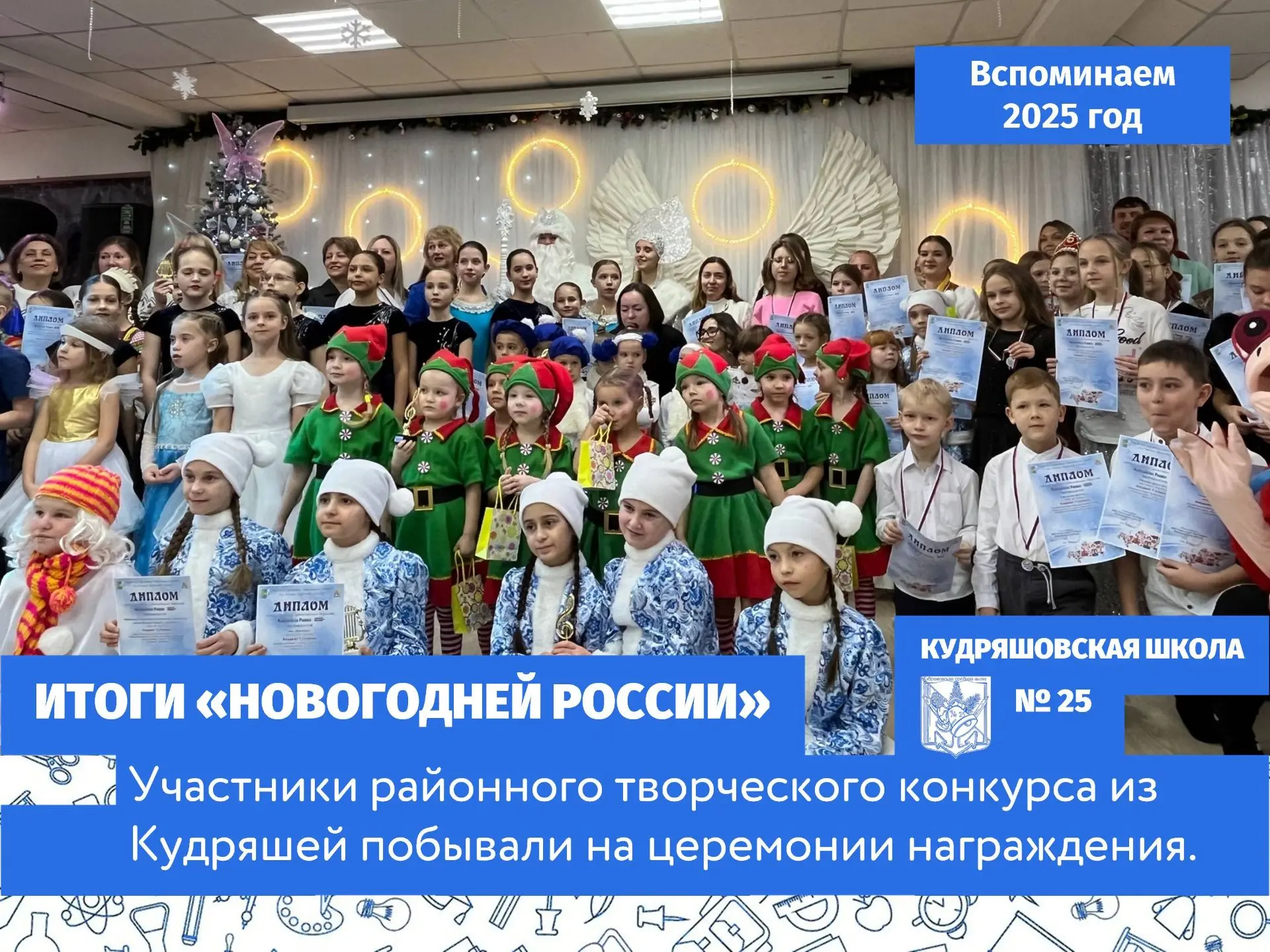 Подходят к завершению 🎄❄️ новогодние праздники… Но чтобы ещё раз зарядиться духом добра и радости на целый год, напомним о районном конкурсе детского творчества «Новогодняя Россия-2025». Почти 1300 работ получили организаторы – Дом детского творчества «Мастер». В их числе были 🎨 рисунки, ✂️ поделки, 🎤 вокальные номера от учеников и родителей Кудряшовской школы № 25. Ребята были удостоены званий лауреатов, дипломантов и участников (см. прилагающийся документ) 👇. А лауреаты 1 степени Виноградова Анна, Мирошникова Ульяна (вокал), Кошкаровы Анна и Антон Сергеевич (вокал) и Петрова Алиса (ИЗО) были приглашены на церемонию награждения, которая состоялась 27 декабря в посёлке Краснообск.