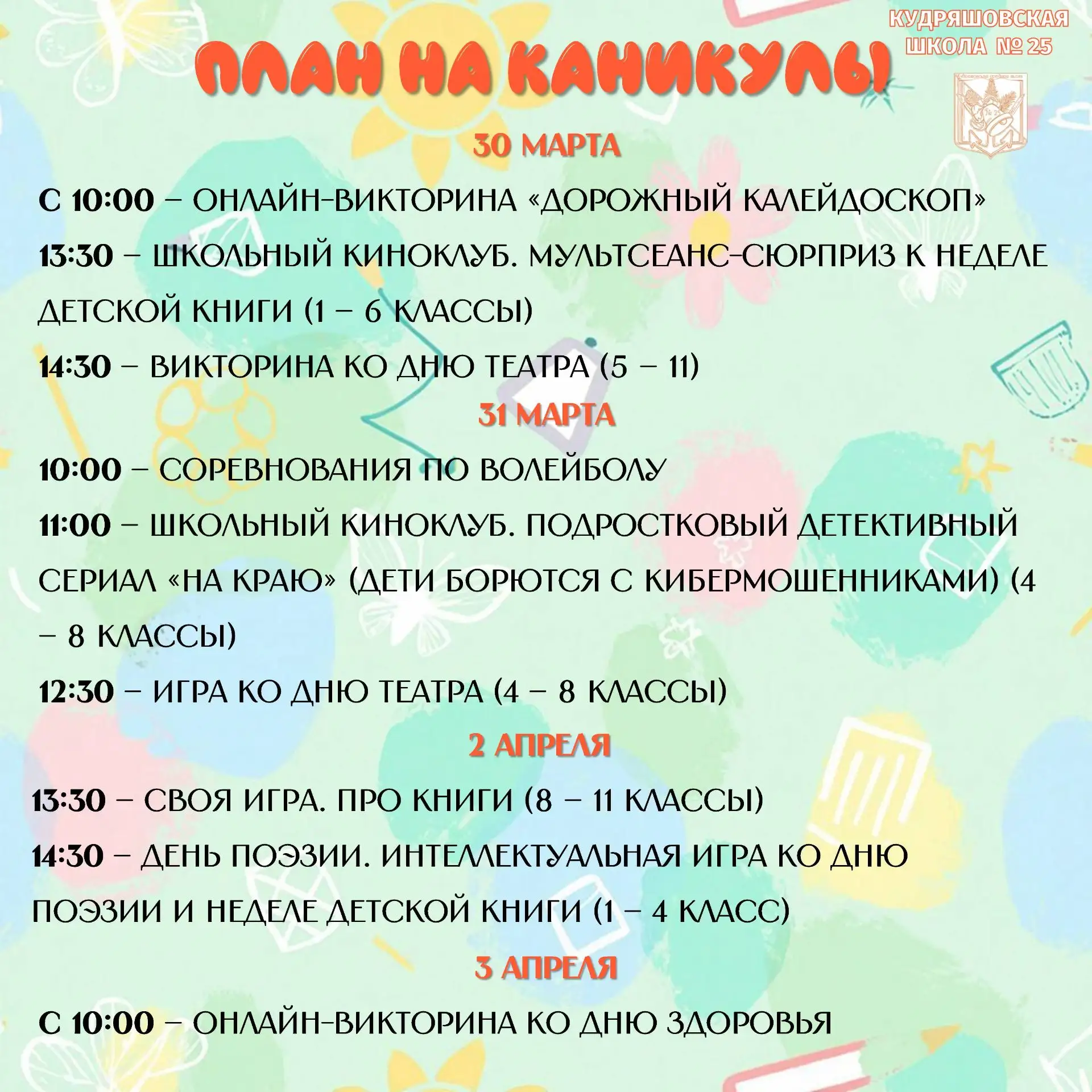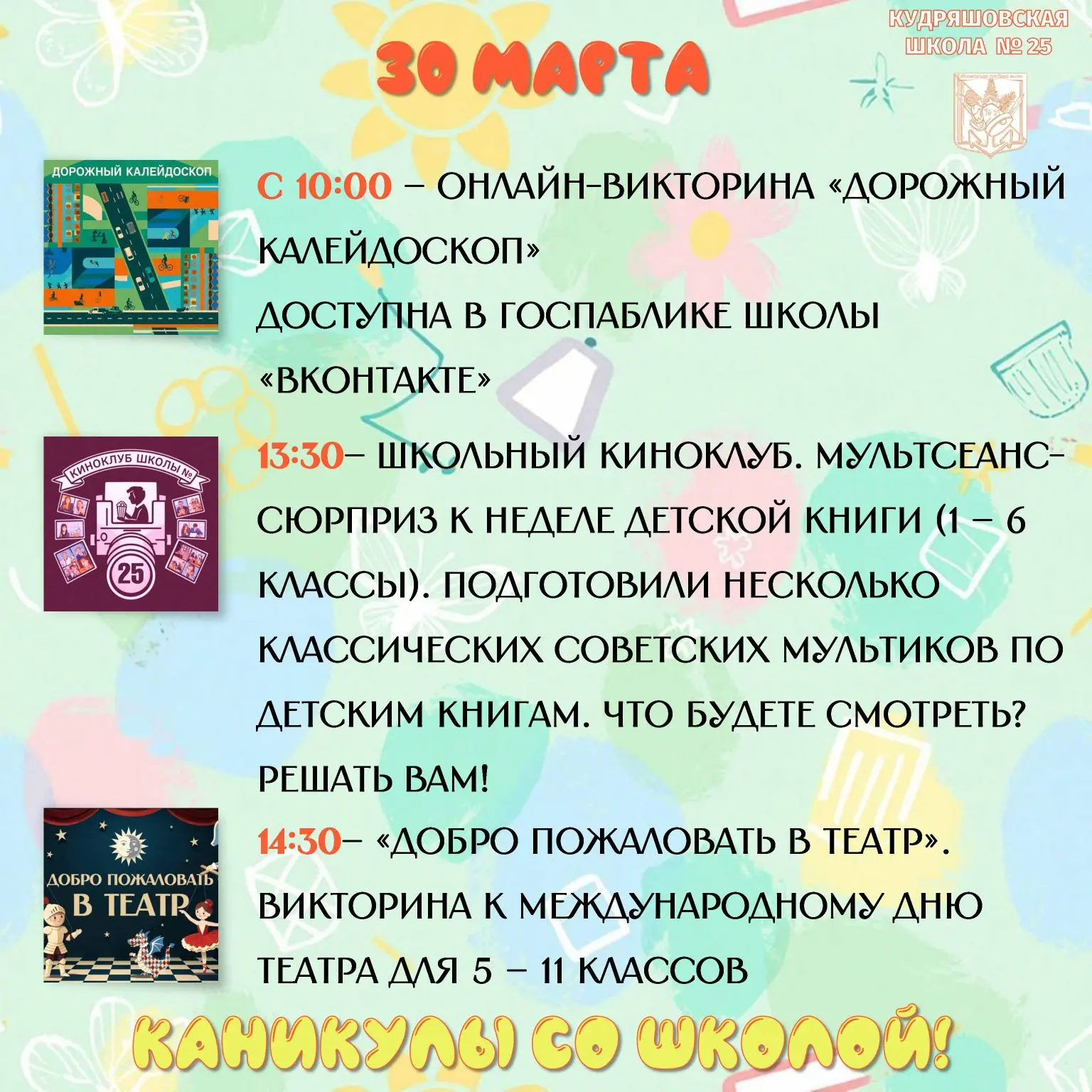 Анонс мероприятий Кудряшовской школы № 25 на завтра, 31 марта.