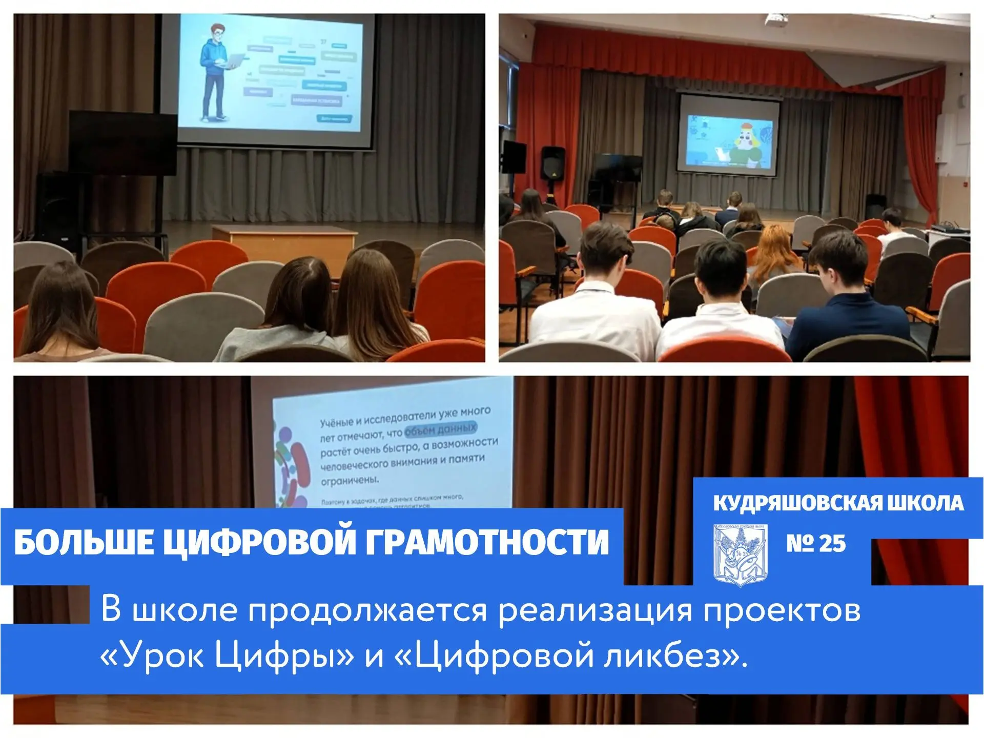 В середине февраля по всей стране проходила Неделя безопасного Рунета. Это общероссийская кампания, посвященная вопросам безопасного и позитивного использования интернета и цифровых технологий. В Кудряшовской школе № 25 проводились занятия в рамках проектов «Урок Цифры» и «Цифровой ликбез». Кроме того, демонстрировались различные 📹 ролики о цифровой безопасности (например, просветительский сериал «На краю»), проводилось ✅ тестирование.