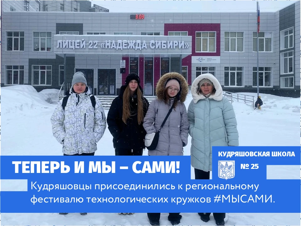3 марта ученики 7 – 8 классов Кудряшовской школы № 25 вместе с советником по воспитанию Анной Сергеевной Киселевой побывали в новосибирском Лицее № 22 «Надежда Сибири». Там проходило 🧪⚙ мероприятие в рамках VI сезона регионального Фестиваля технологических кружков #МЫСАМИ.