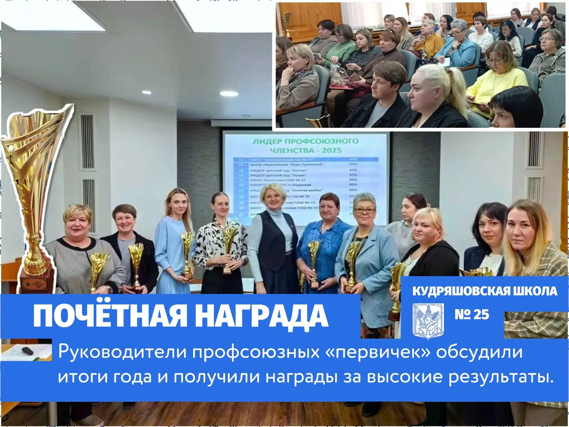 А в завершении встречи первичные профсоюзные организации, показавшие устойчивые результаты деятельности первичной профсоюзной организации и высокий уровень профсоюзного членства в учреждении, были награждены 🏆 кубком «Лидер профсоюзного членства-2025». Обращаясь к награждённым (в числе которых и наша школа), председатель районной профорганизации Эмма Борисовна Тихомирова поблагодарила их за солидарные действия по сплочению и развитию педагогических коллективов.