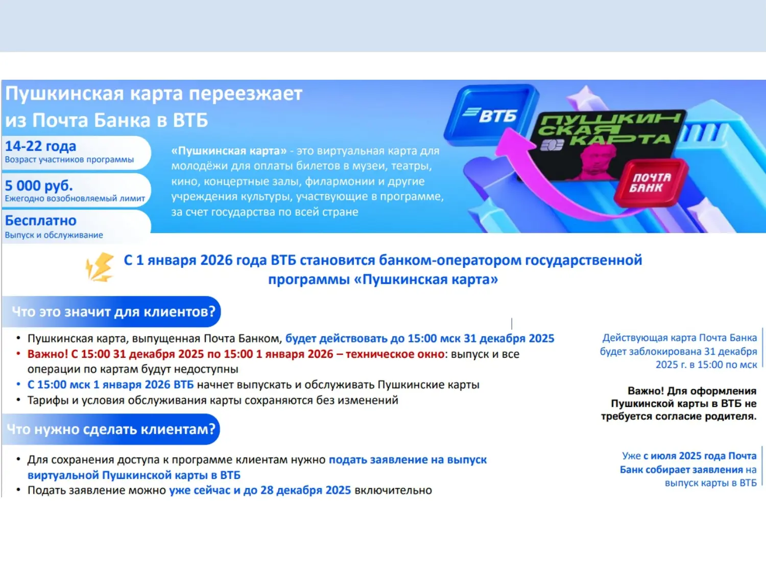 Важно! «Пушкинские карты», выпущенные Почта Банком, действует до 15:00 часов 31 декабря 2025 года.